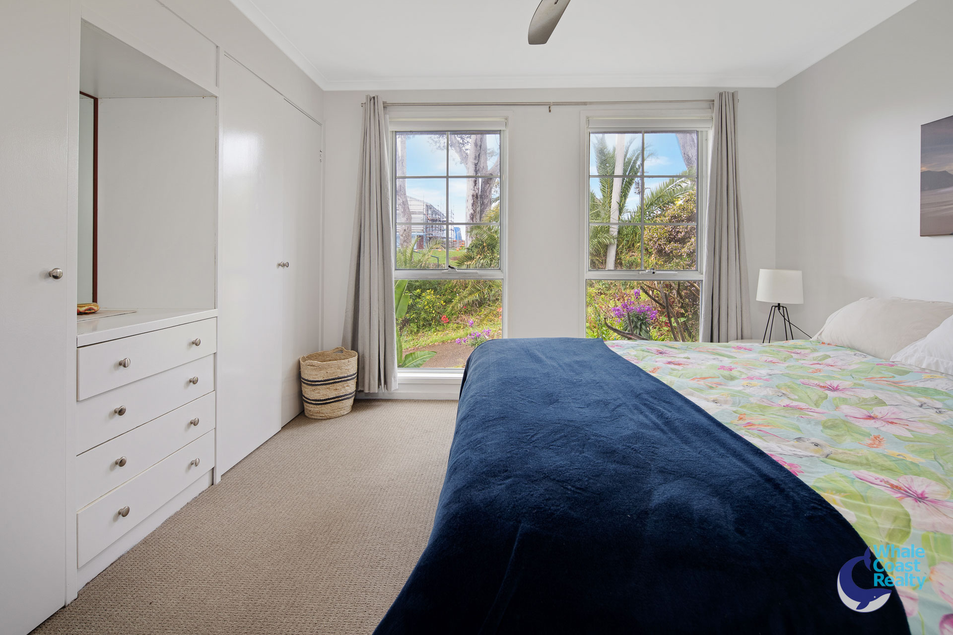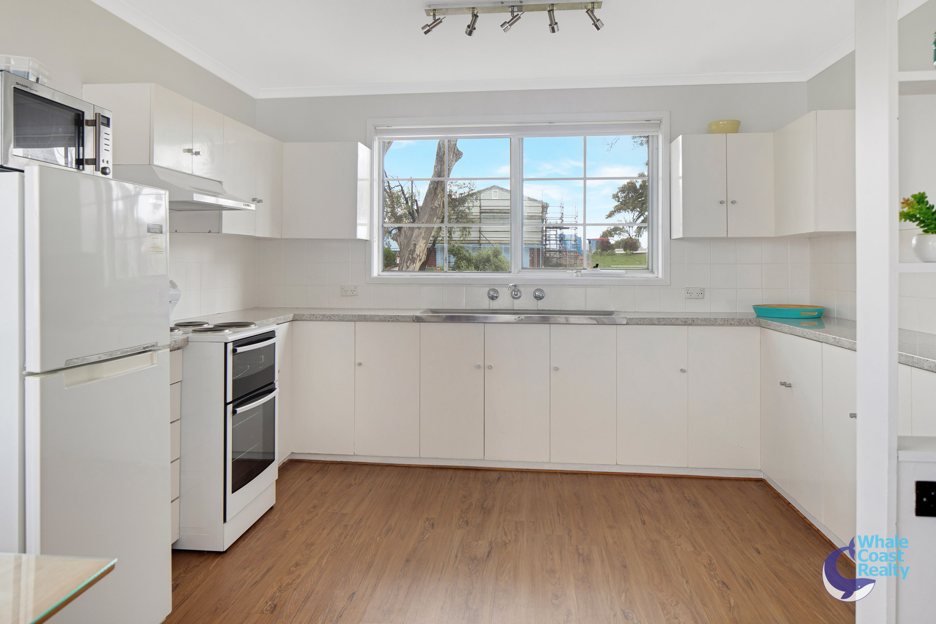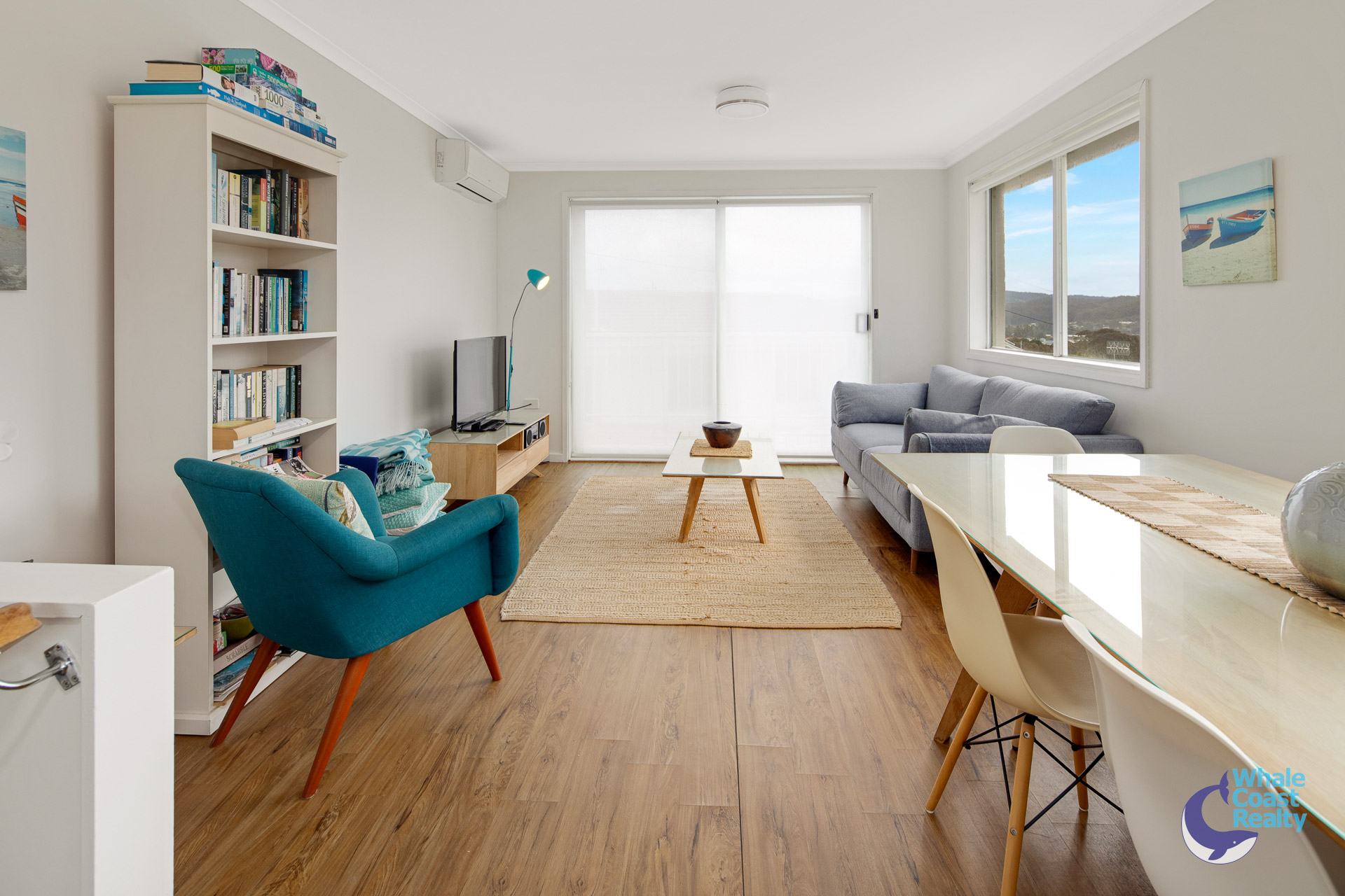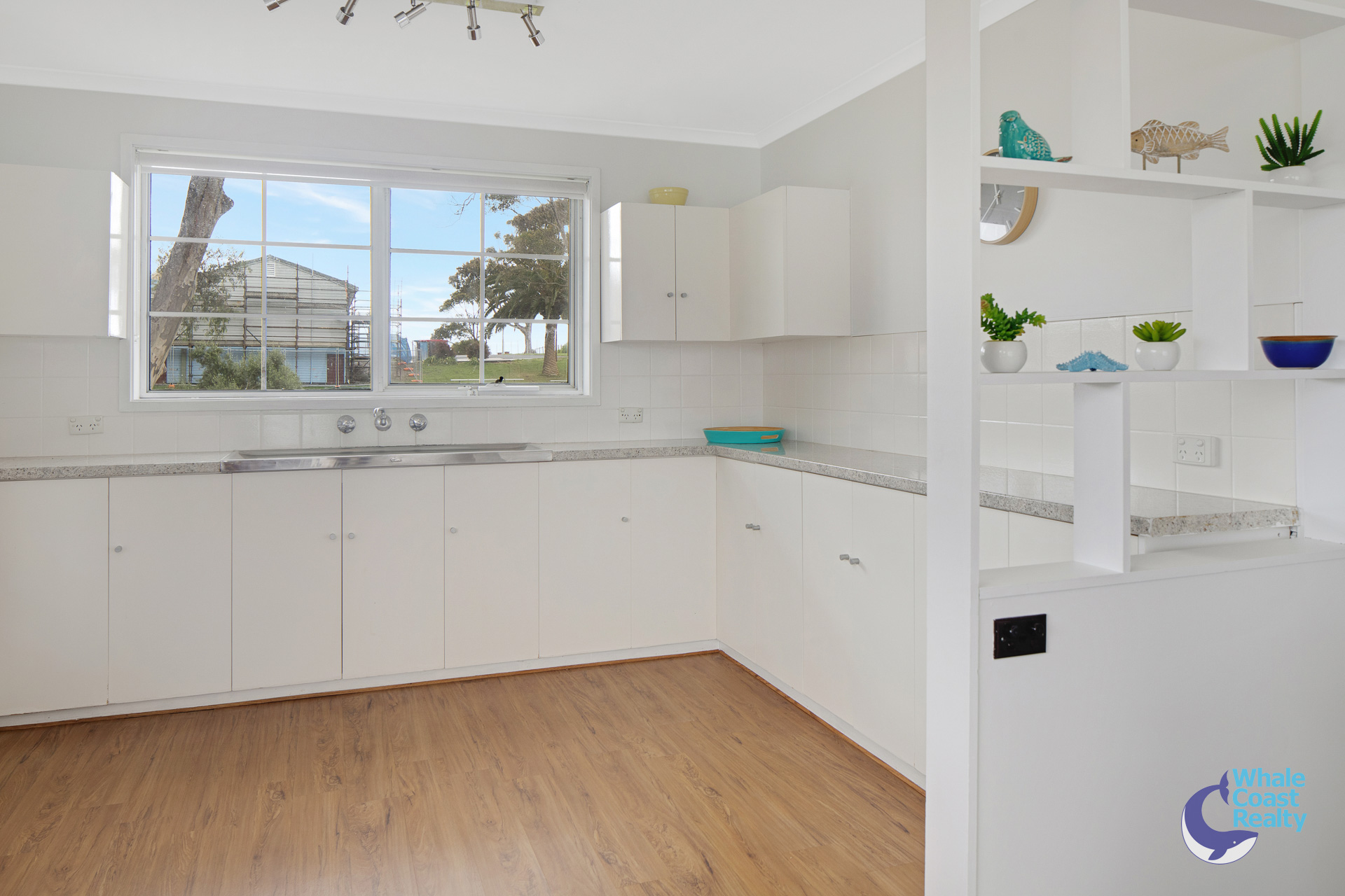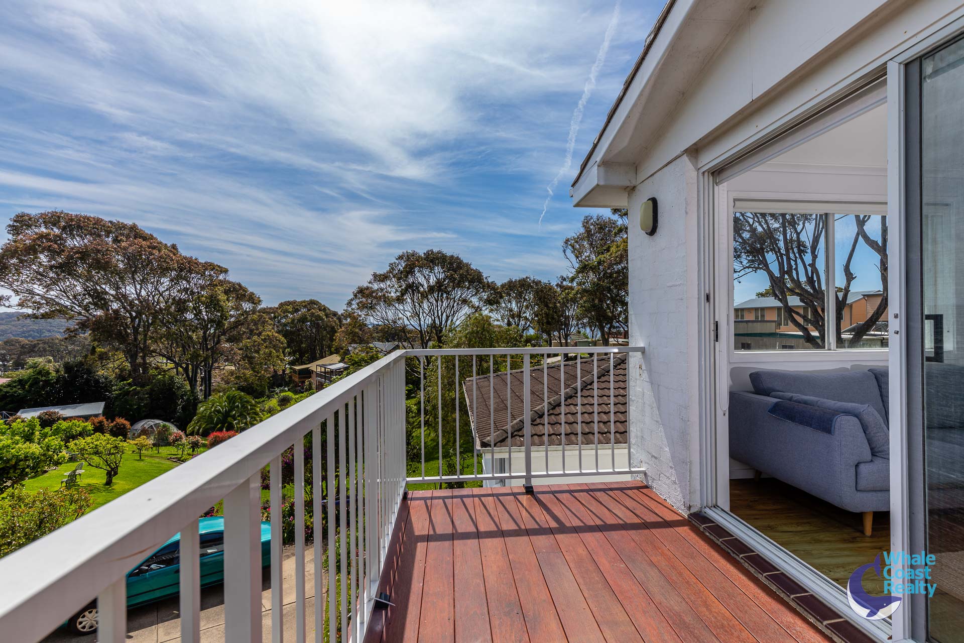 Some modern updates in the kitchen and air-conditioned living area. White cabinetry offers plenty of storage and a clean look. The simplicity of white paintwork flows throughout and timber look floors, all offering a beachy aesthetic. A sliding door out to an undercover deck that offers views of the Wagonga Inlet and its boating.