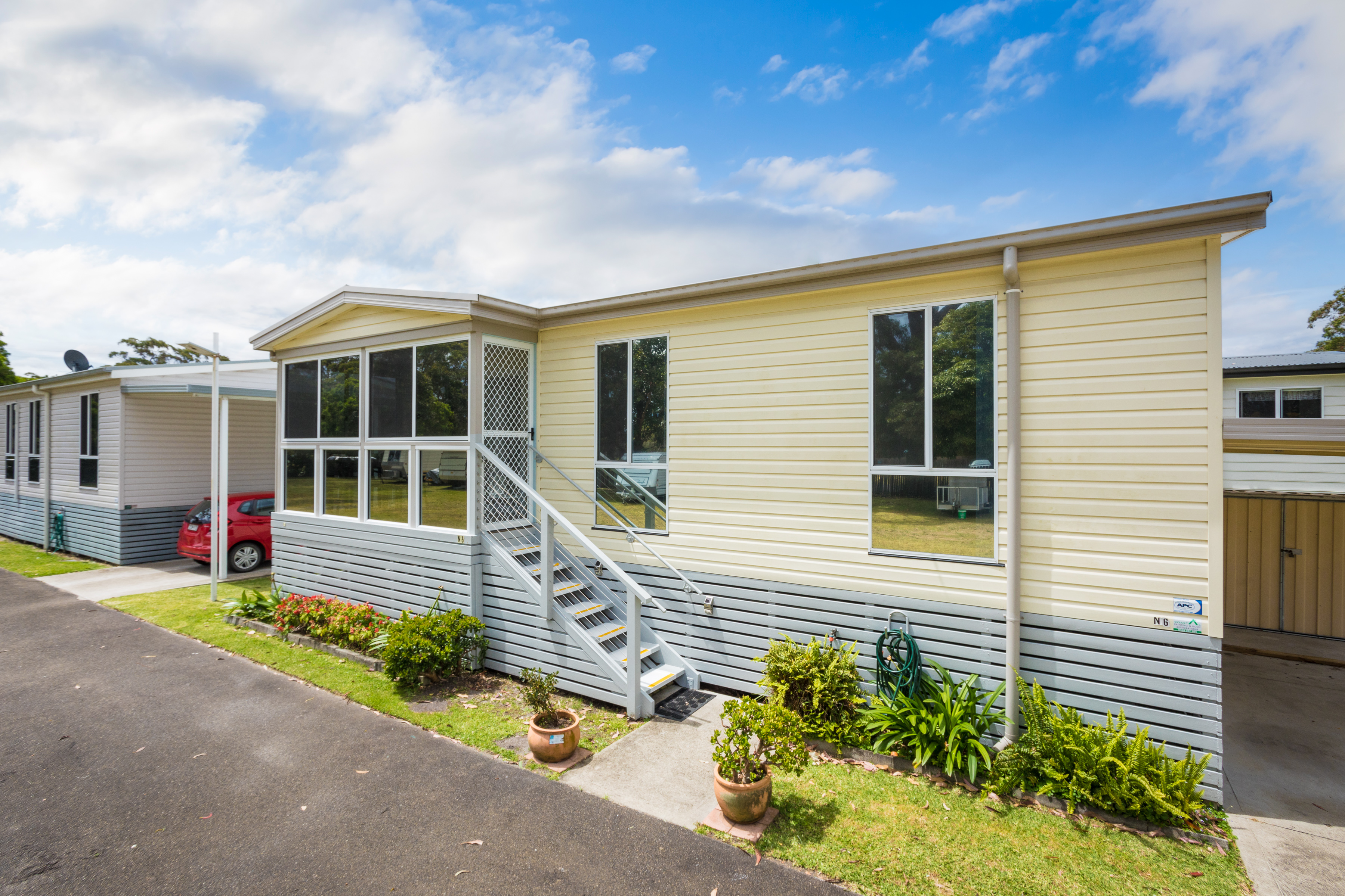 This free-standing two-bedroom tidy villa has a generous size open-plan kitchen with dining and plenty of living space. Plus, an enclosed deck.