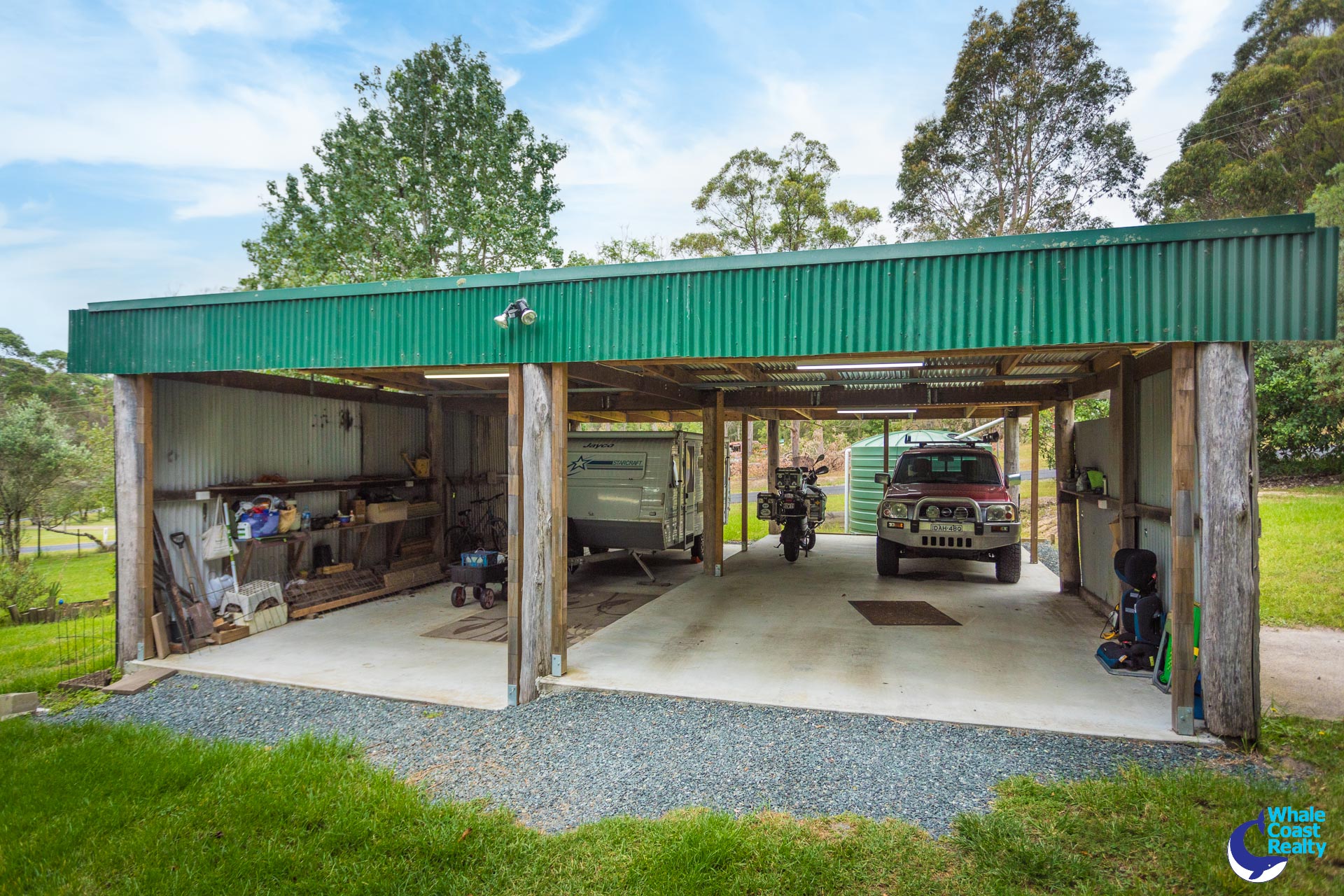 Guest accommodation with 2 bedrooms (1 a loft), one bathroom, a living area and its own private entrance comes off the back outdoor undercover BBQ area, great for the family. Caravan, boat car spaces are available with a 4-berth concrete floor shed with power supply offering ample space to accommodate cars, tools, or equipment.
