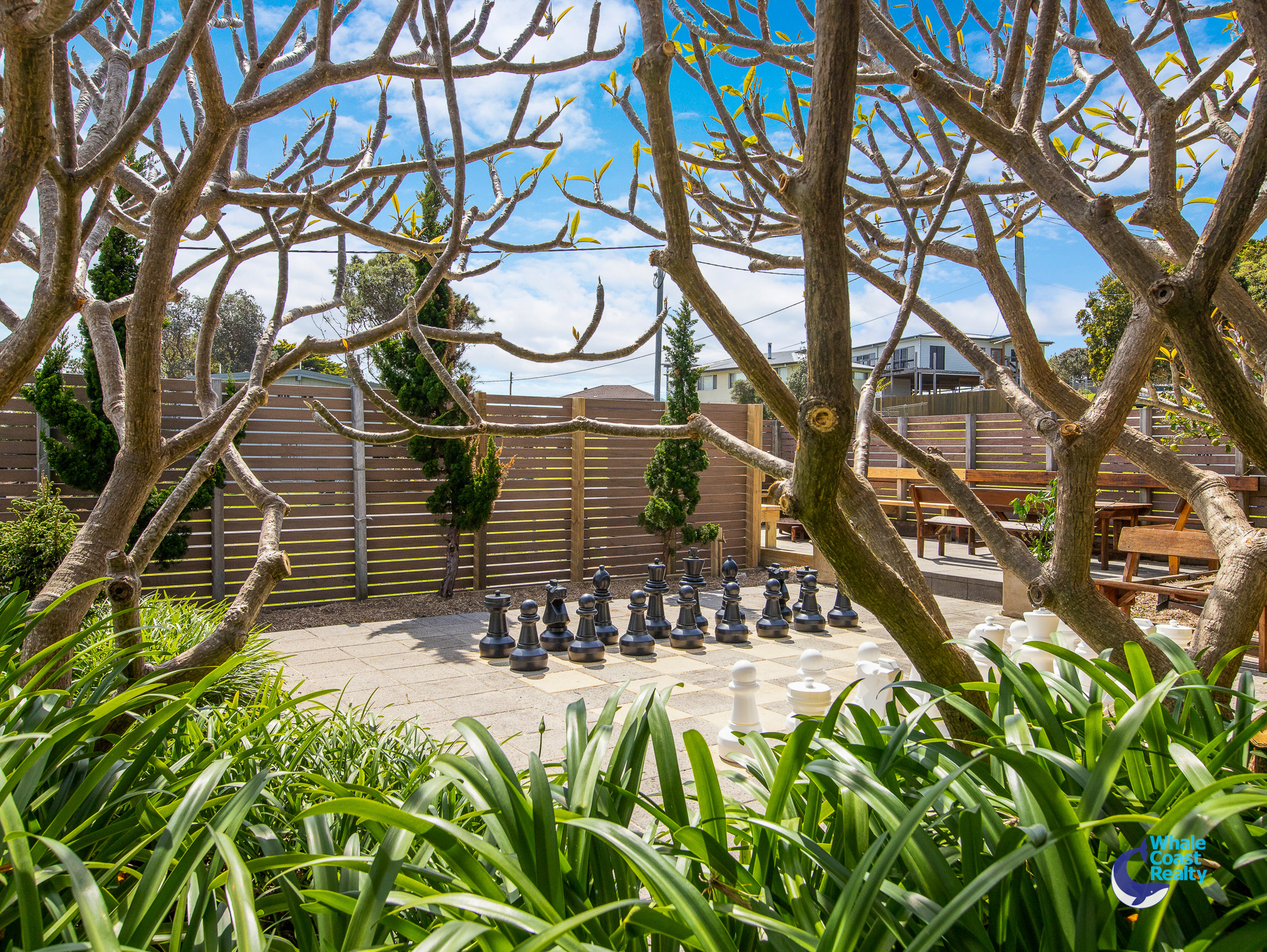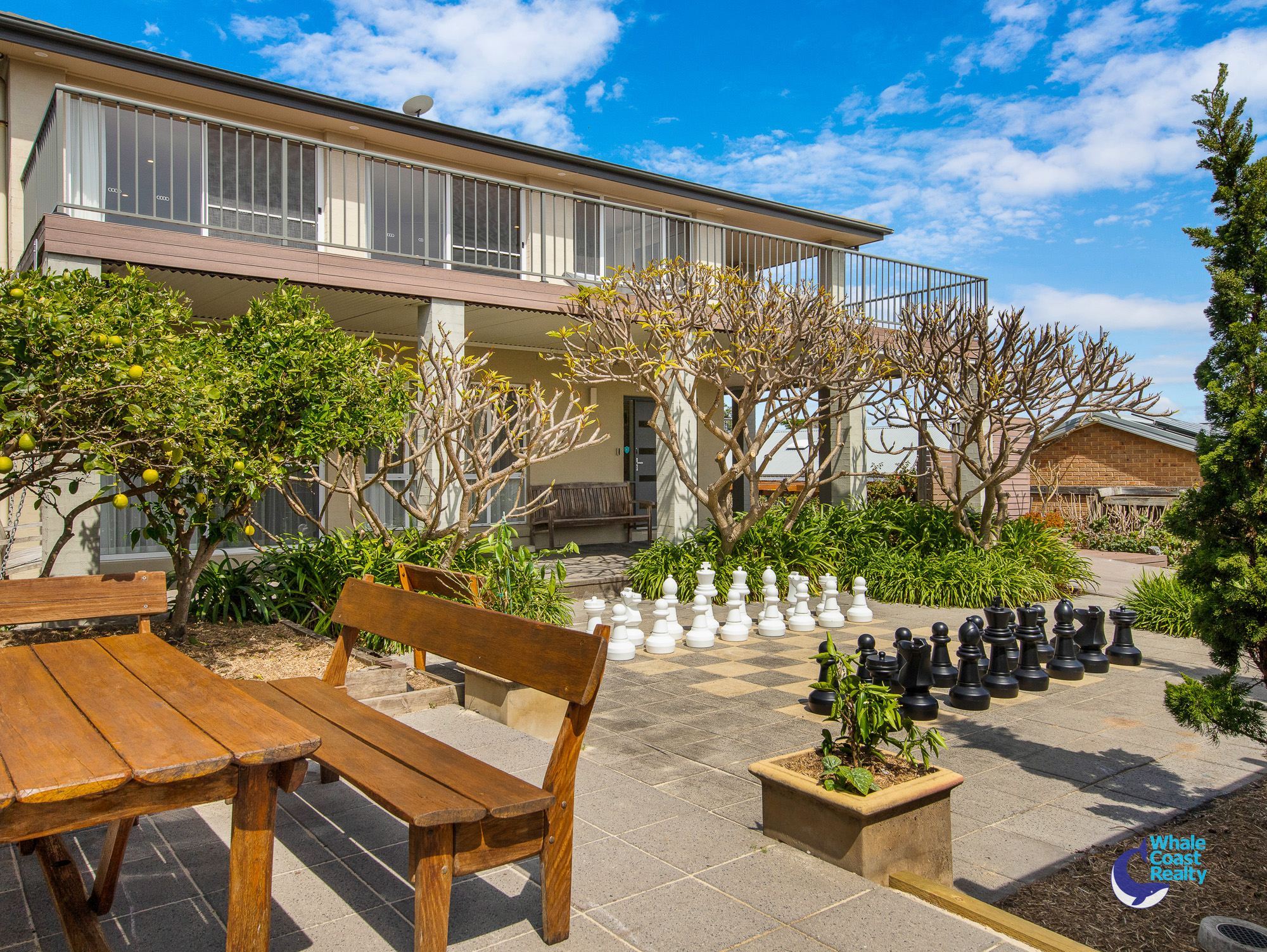 - Outdoor living: low-maintenance gardens, fire pit zone, outdoor hot & cold shower, fruit trees, courtyard with giant chessboard, 10,000L water tank