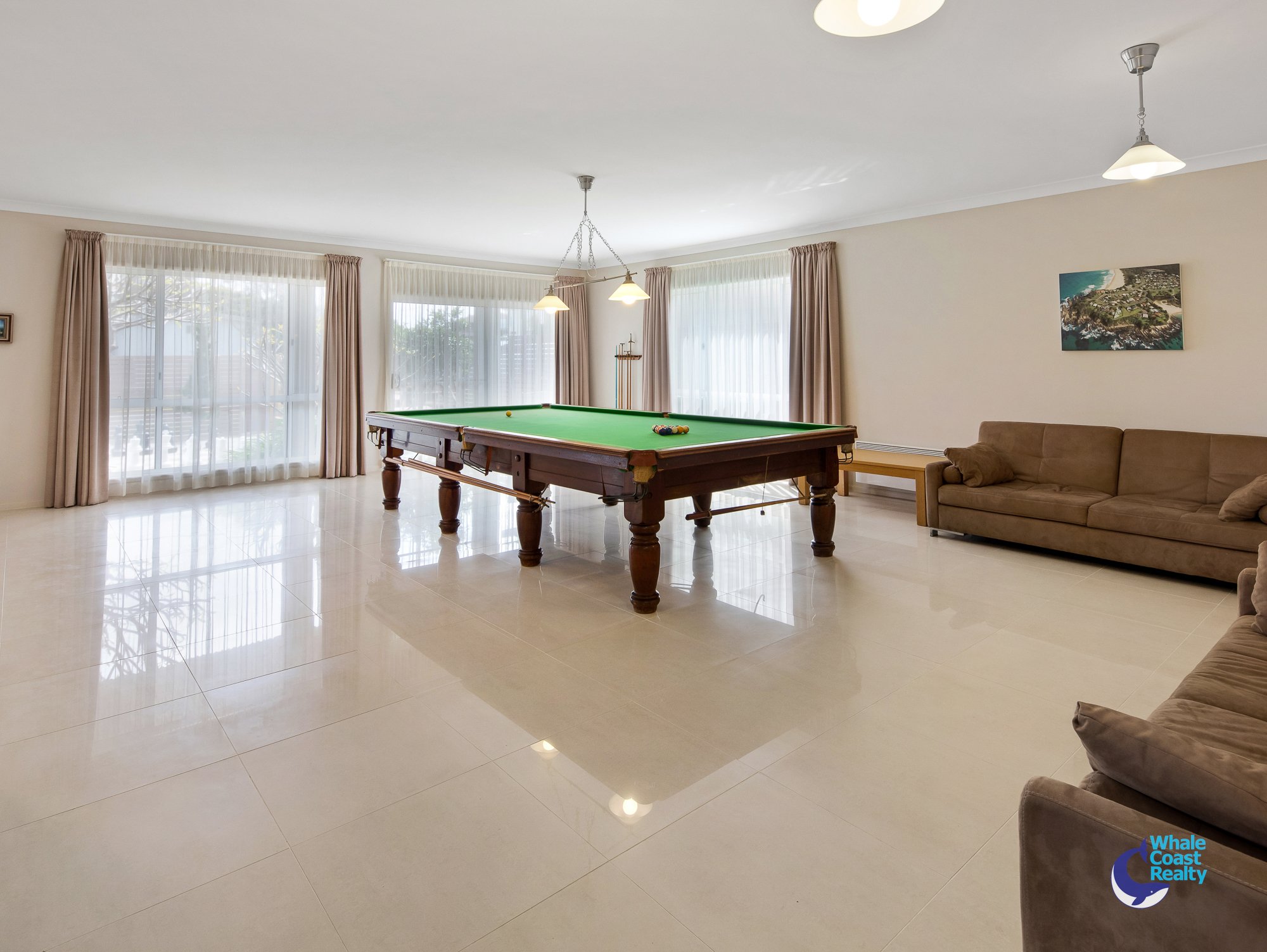 - Downstairs retreat: games room with full-size billiard table, kitchenette, wine cellar, 2 bedrooms with BIRs, 3-way bathroom, laundry & storage