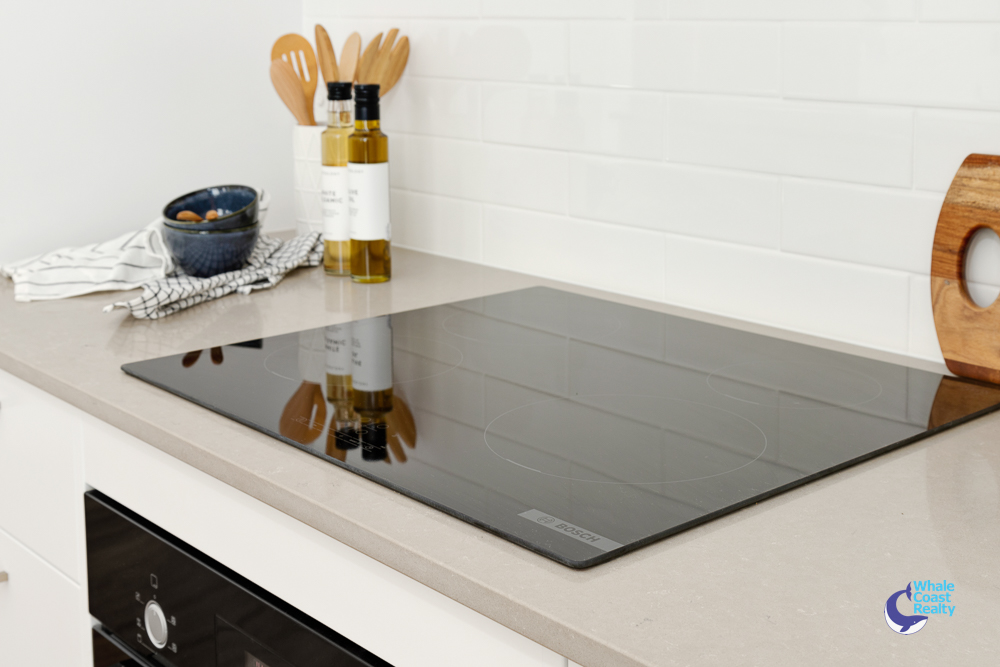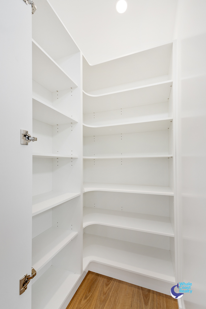The modern kitchen boasts a large pantry, Bosch appliances, including a dishwasher, oven, and induction cooktop, along with a stainless steel double sink and soft-close cabinetry.