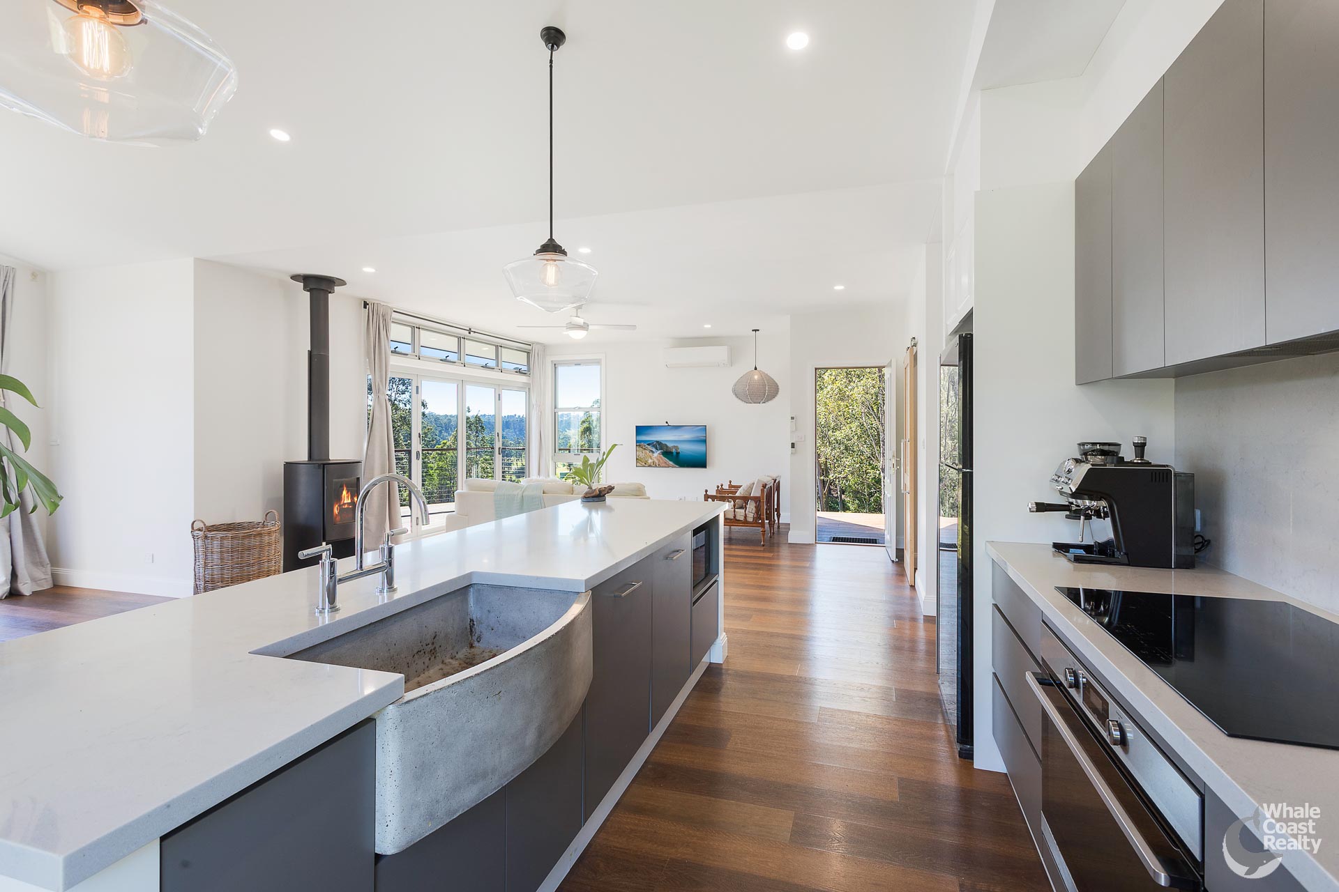 The open-plan kitchen, living, and dining area has great design features, including incredible high raked ceilings, quality finishes throughout, lovely Nectre wood fireplace, air conditioning, and excellent cabinetry finishes. Three spacious bedrooms, all with high ceilings, have built-in wardrobes, and the home includes a impressive 3 way bathroom for ease of use with the boot room/laundry, and energy-efficient appliances.