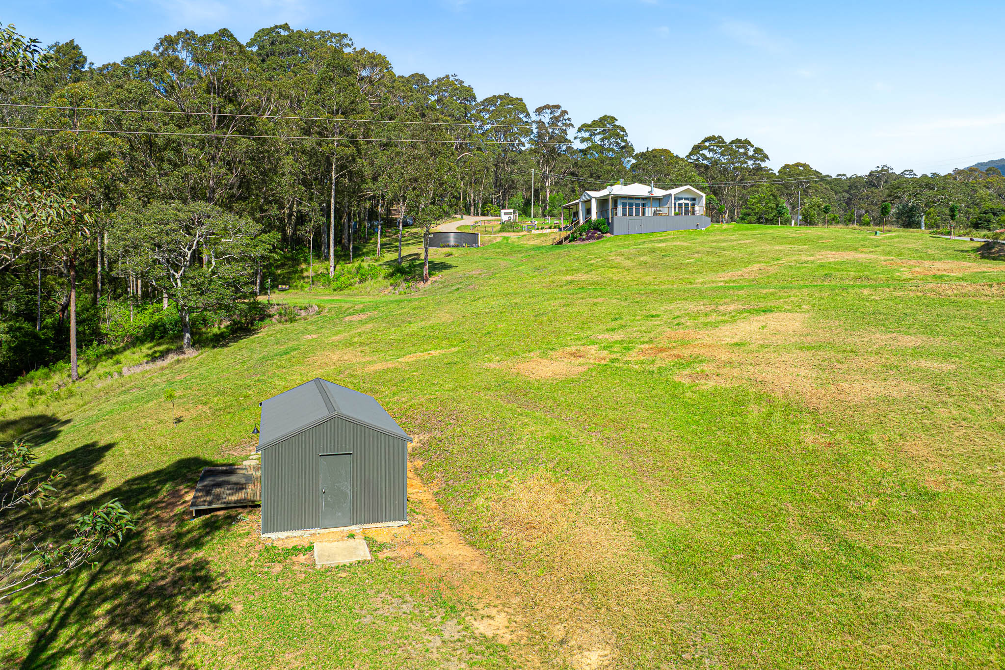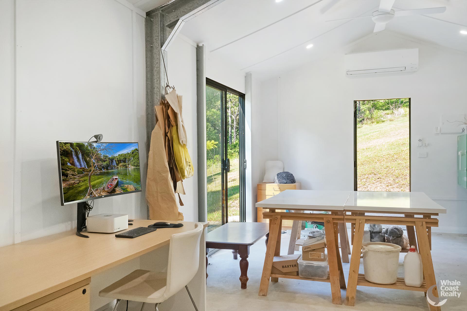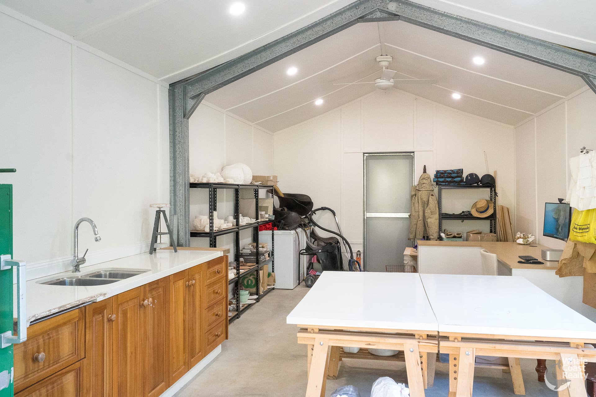 The studio includes three-phase power and water offering endless possibilities—currently a pottery space, it could be a yoga or creative retreat. On the other side of the property are four fenced paddocks, a creek with a swimming hole and riparian rights, and infrastructure ideal for livestock and orchards.