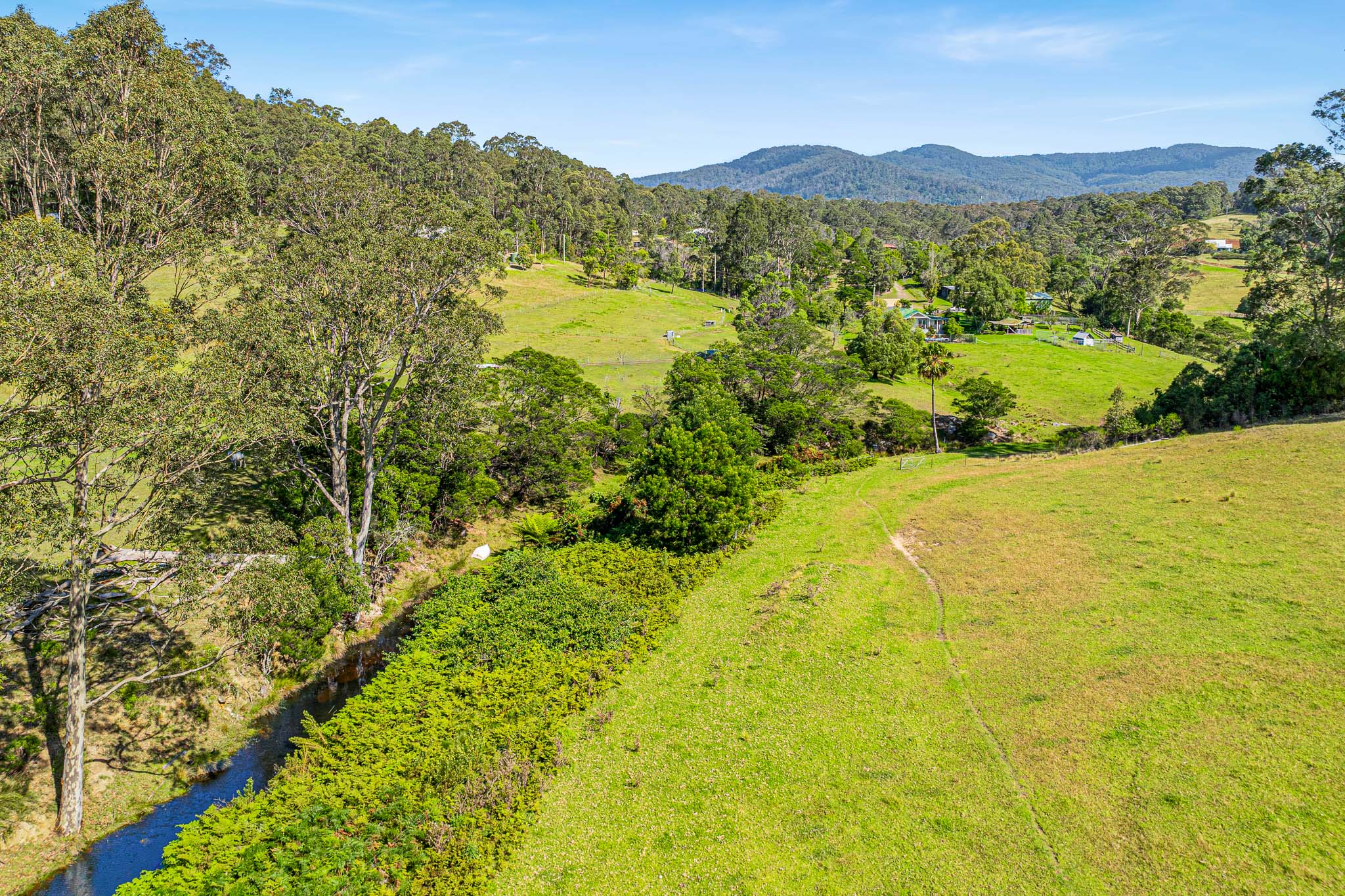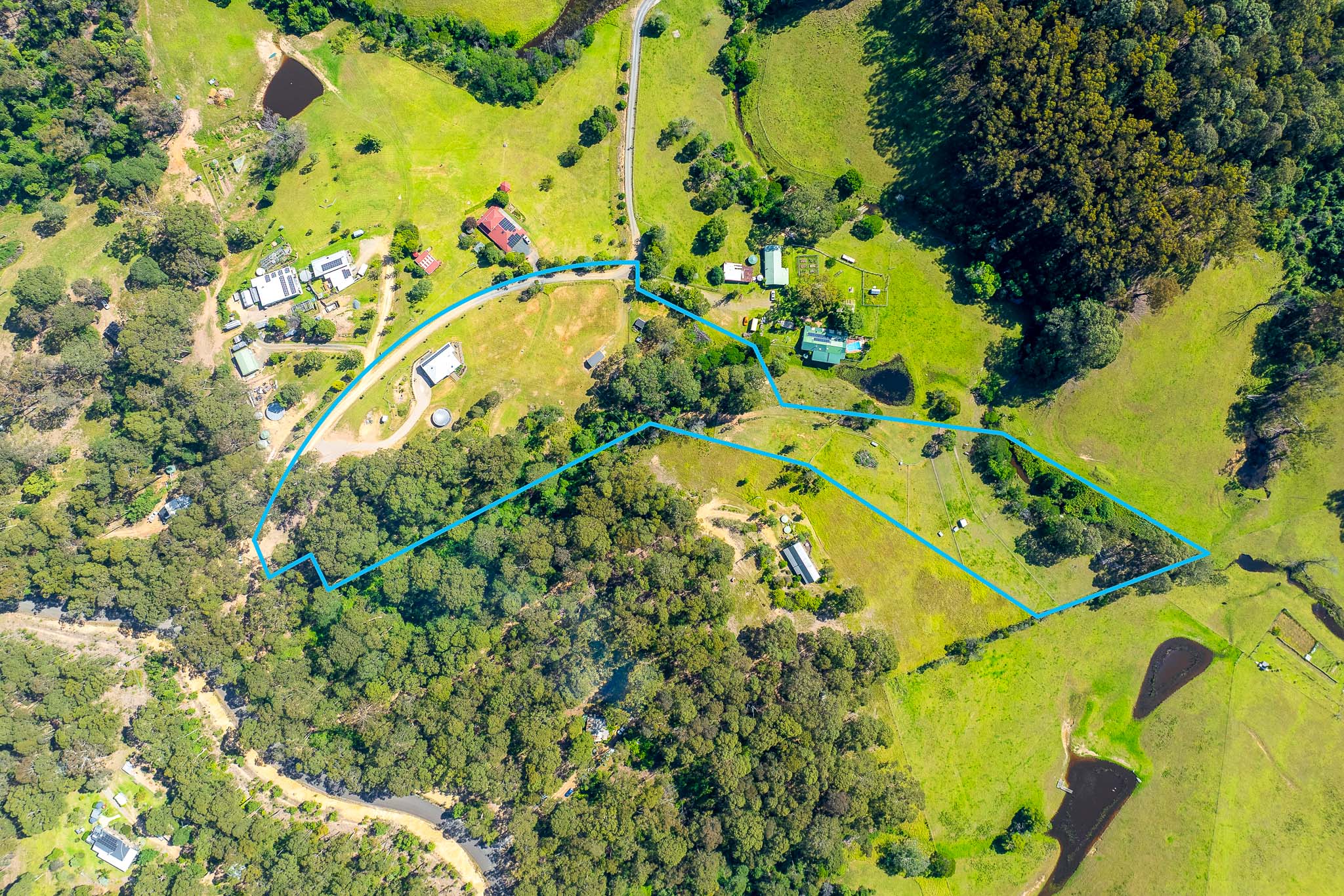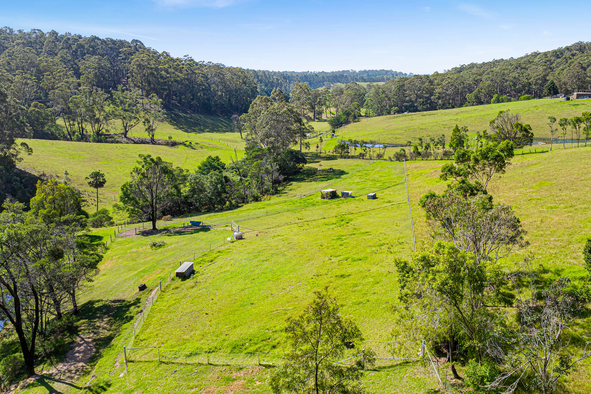 The studio includes three-phase power and water offering endless possibilities—currently a pottery space, it could be a yoga or creative retreat. On the other side of the property are four fenced paddocks, a creek with a swimming hole and riparian rights, and infrastructure ideal for livestock and orchards.