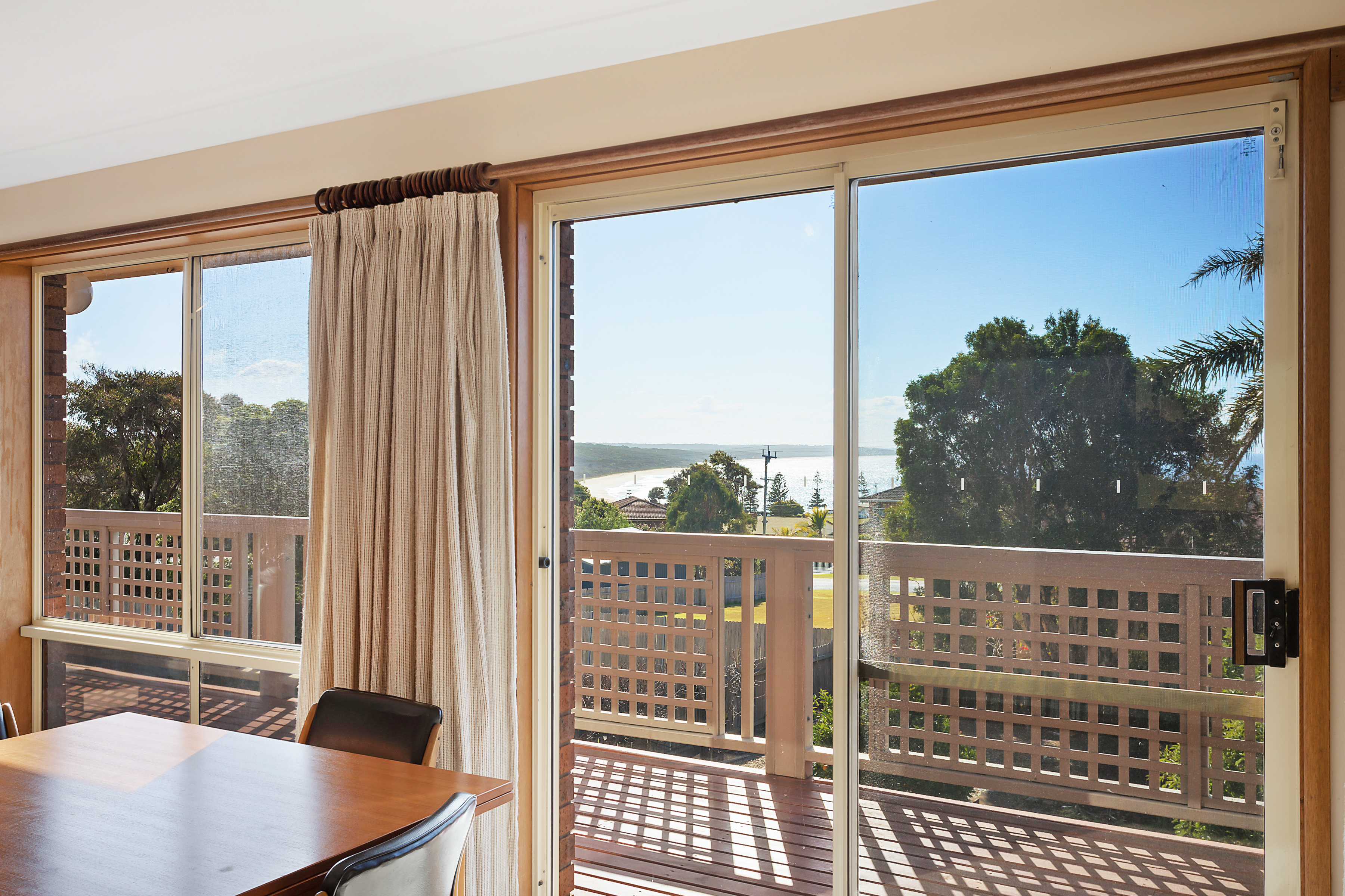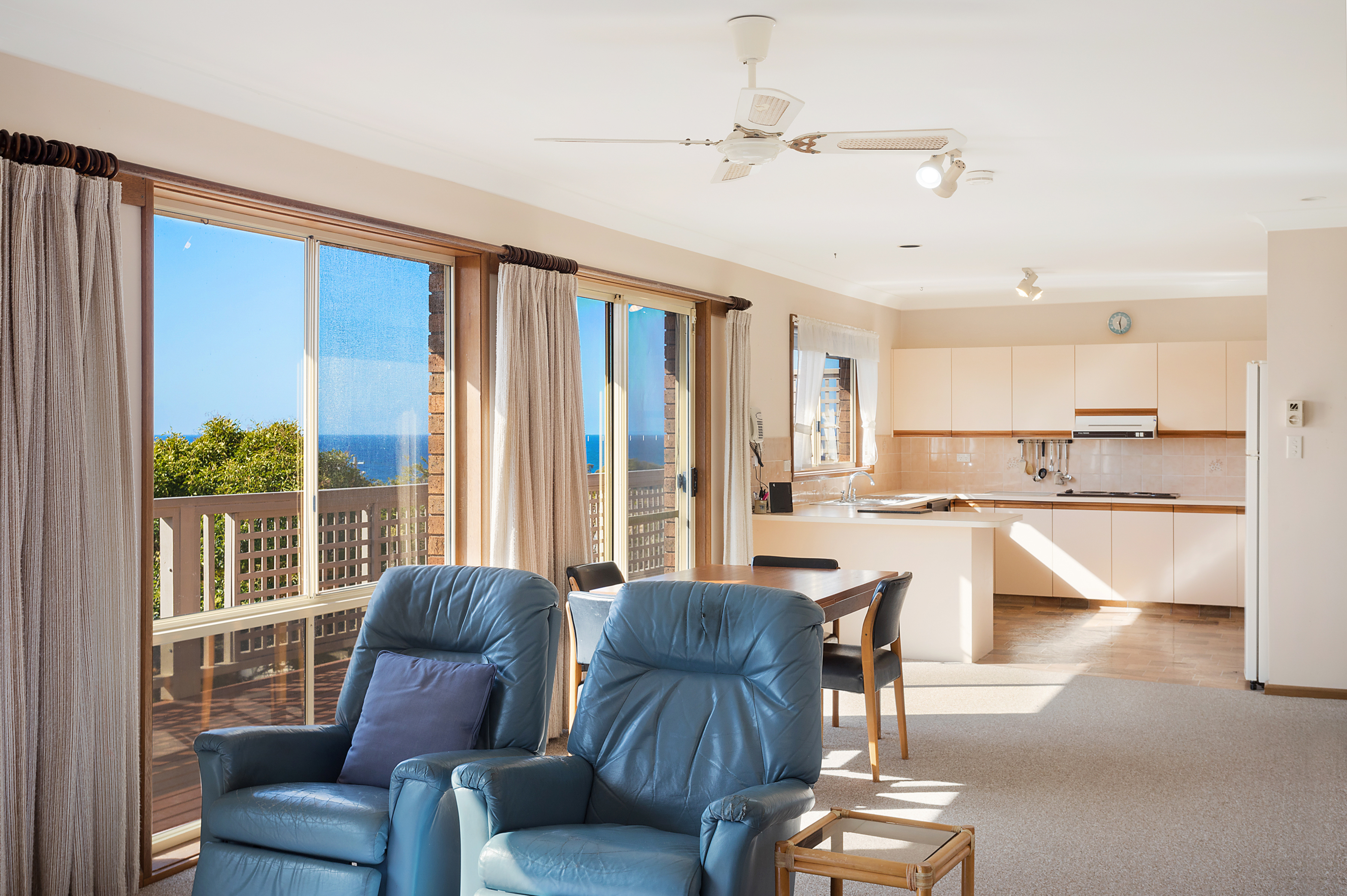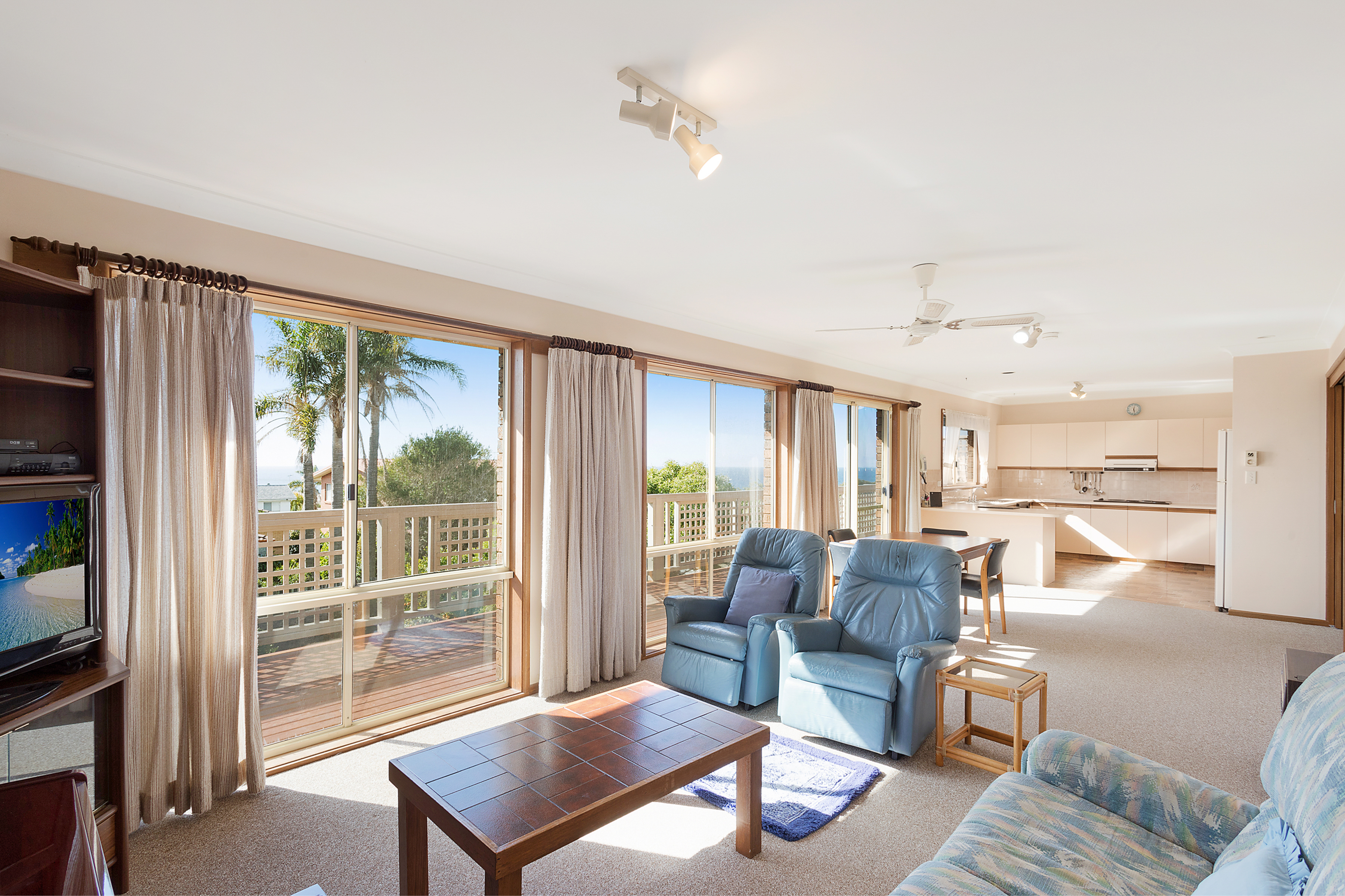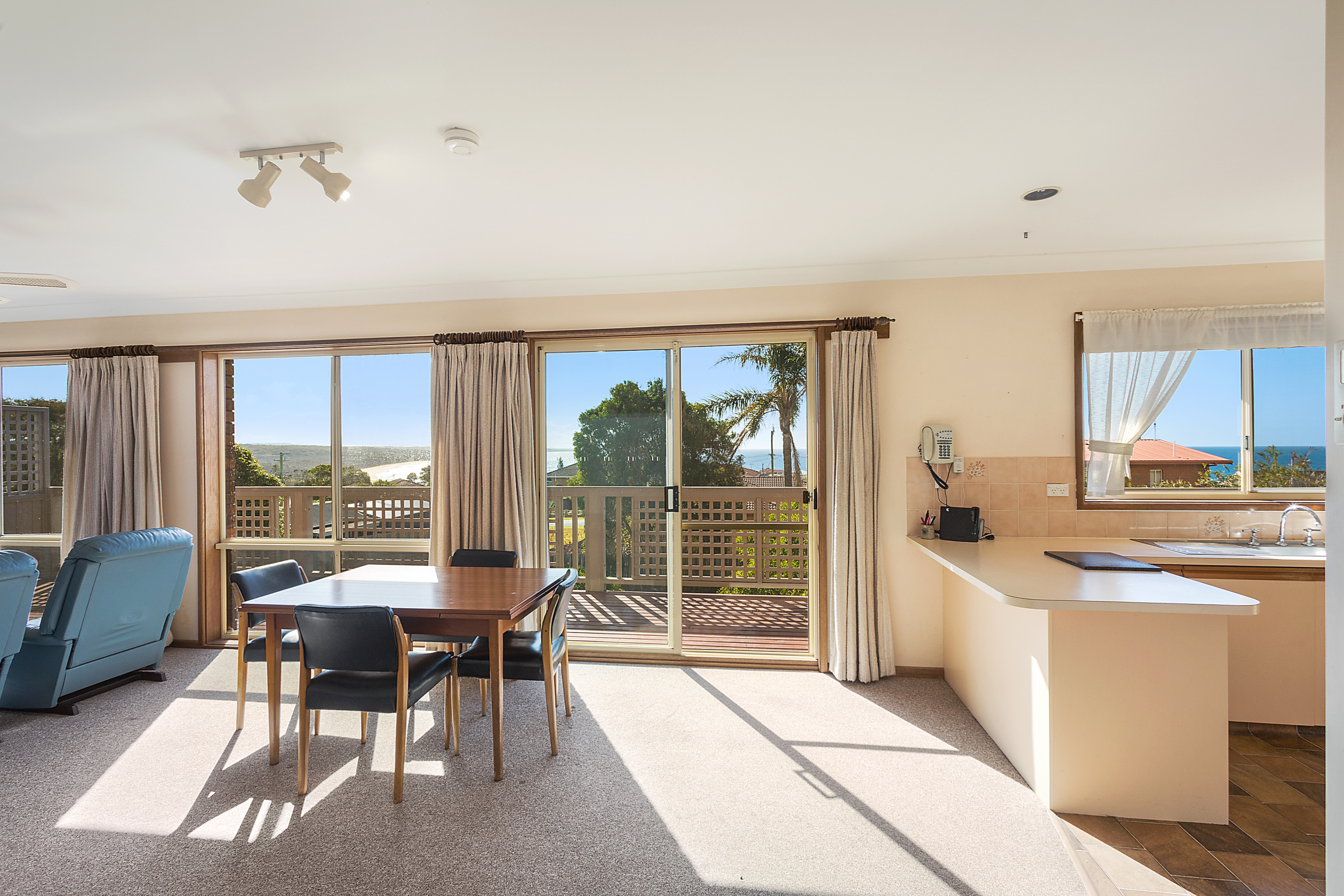 Basking in sunlight the living area, kitchen and exterior deck afford a northerly aspect with beach and ocean views.