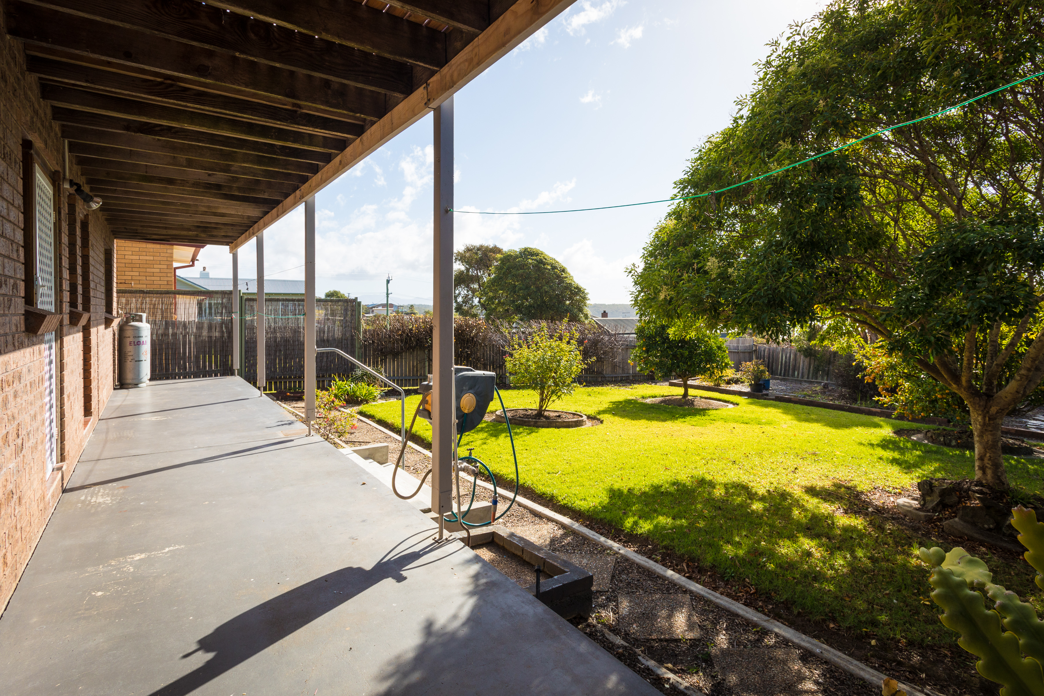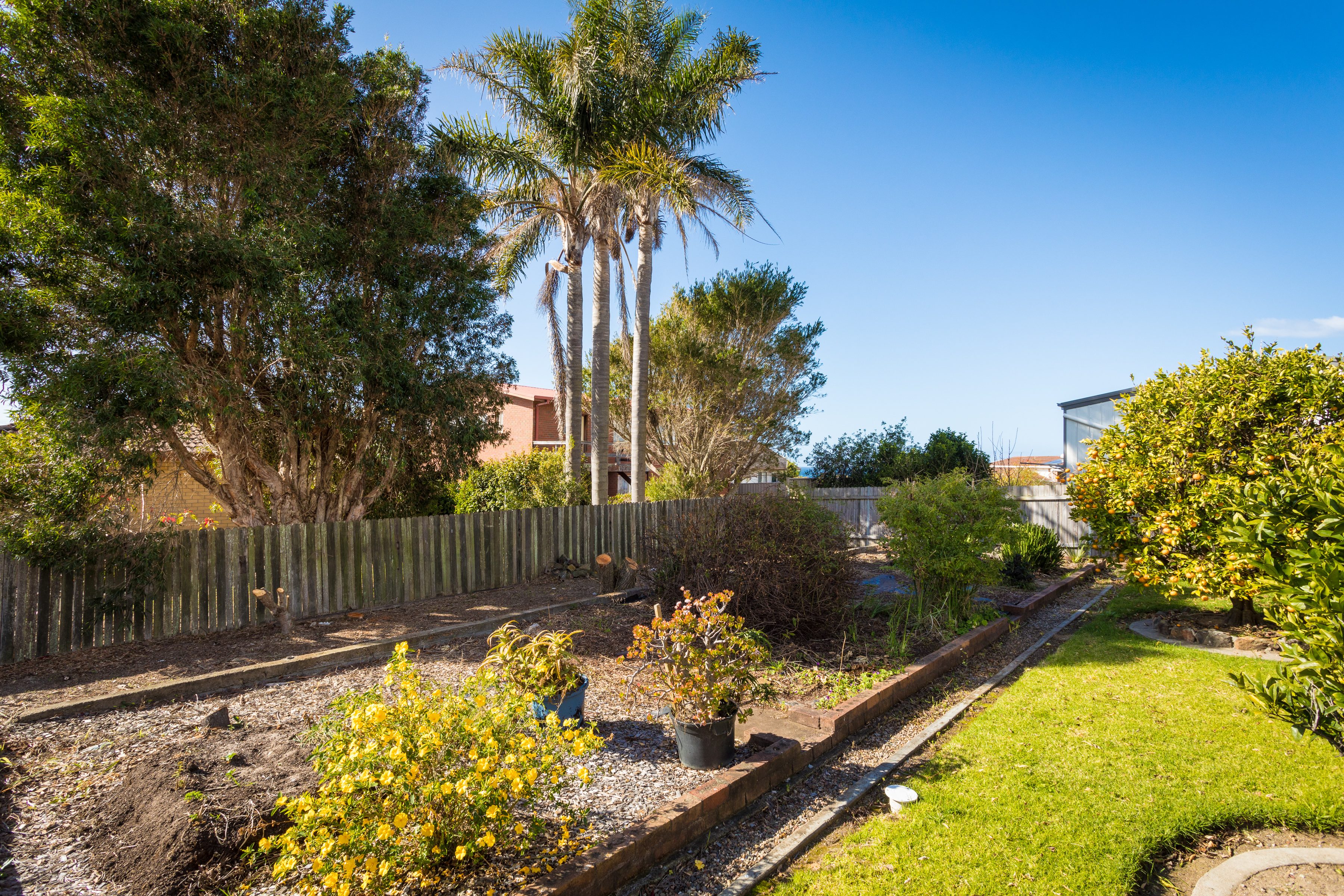 An easy to maintain and fenced rear yard has established citrus trees and there is a plot in place for an ideal vegetable garden.