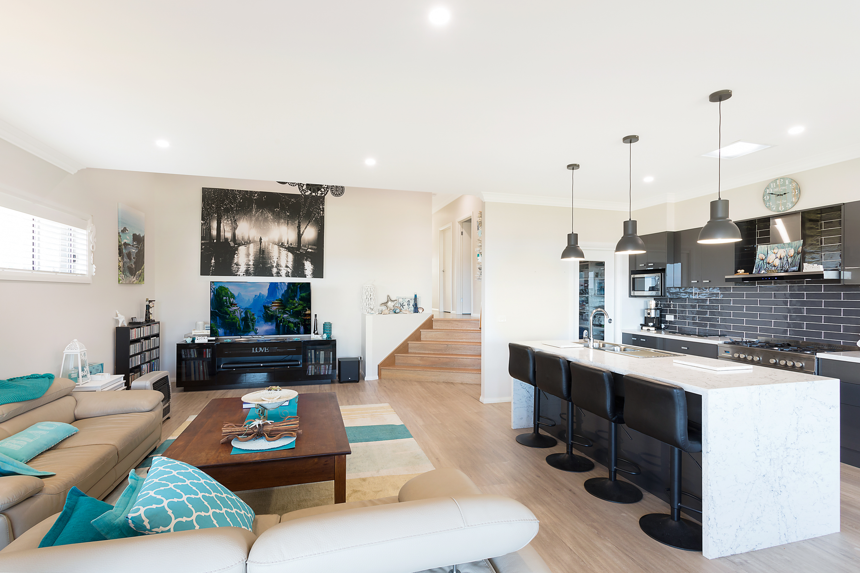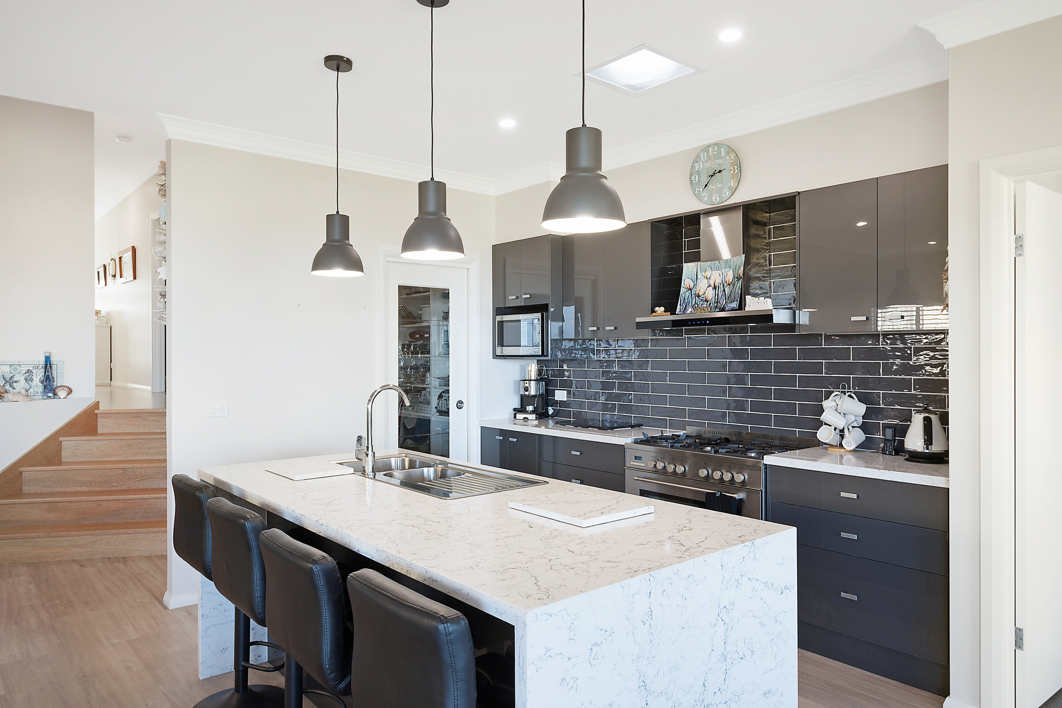 Once you step inside the door, you will be amazed at the open floor plan concept, with high ceilings, a Chef's dream kitchen, with 4 mm thick Ceasar Stone bench tops and island bench, complimented by a 900mm gas cook top, with stainless steel appliances and a walk-in pantry .