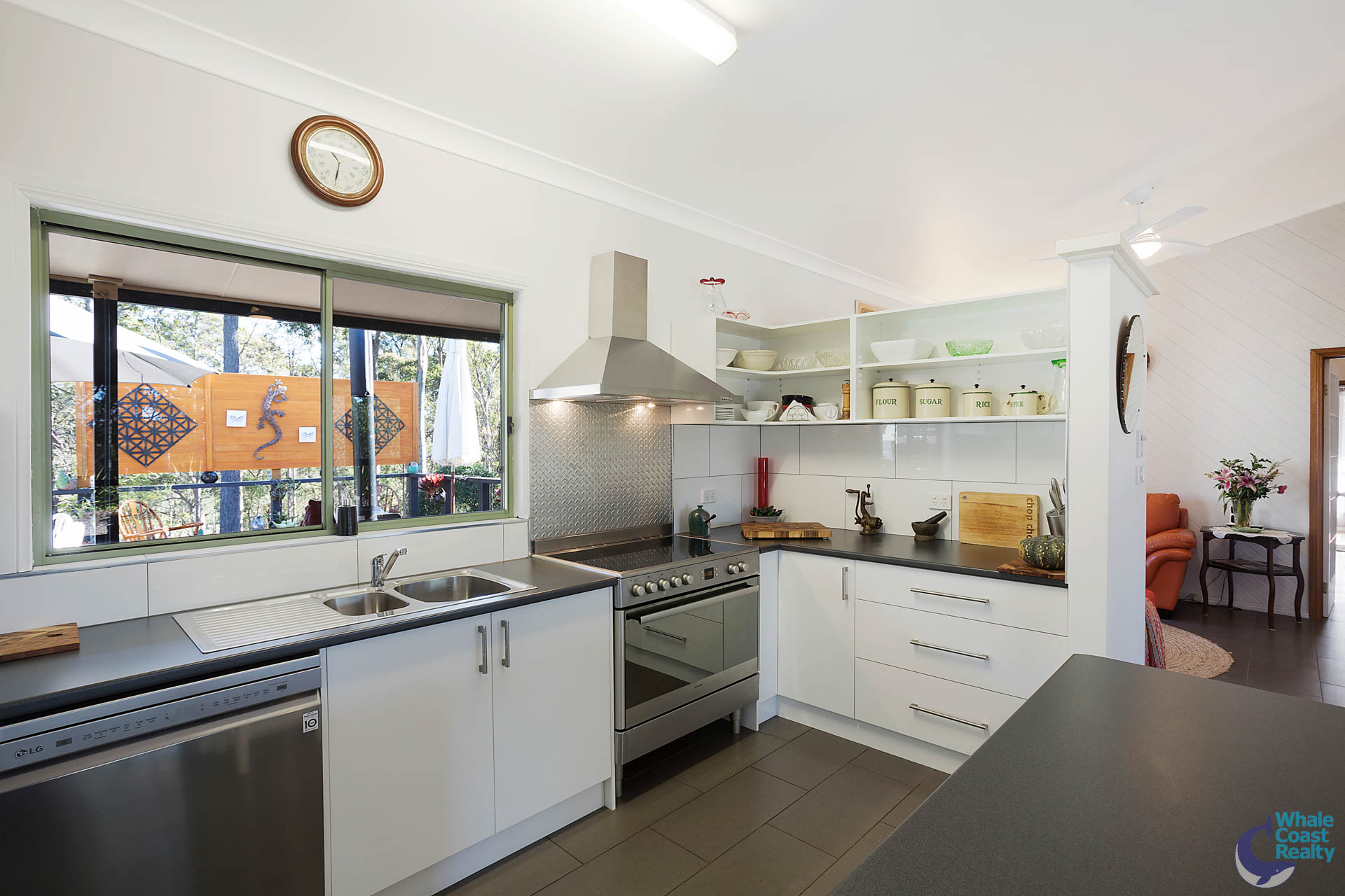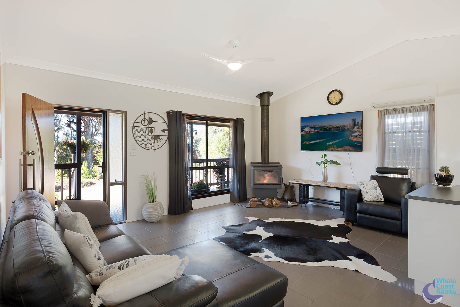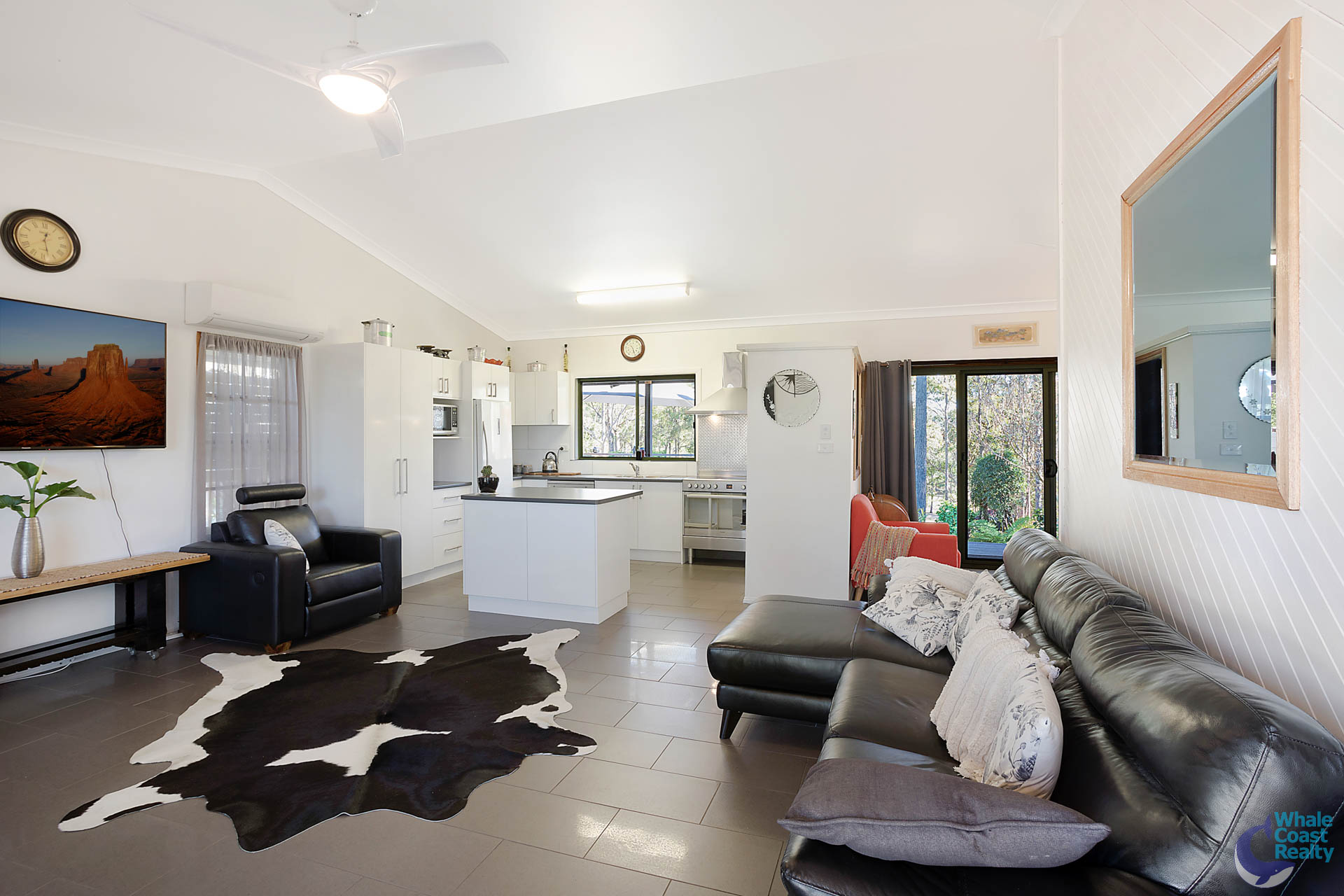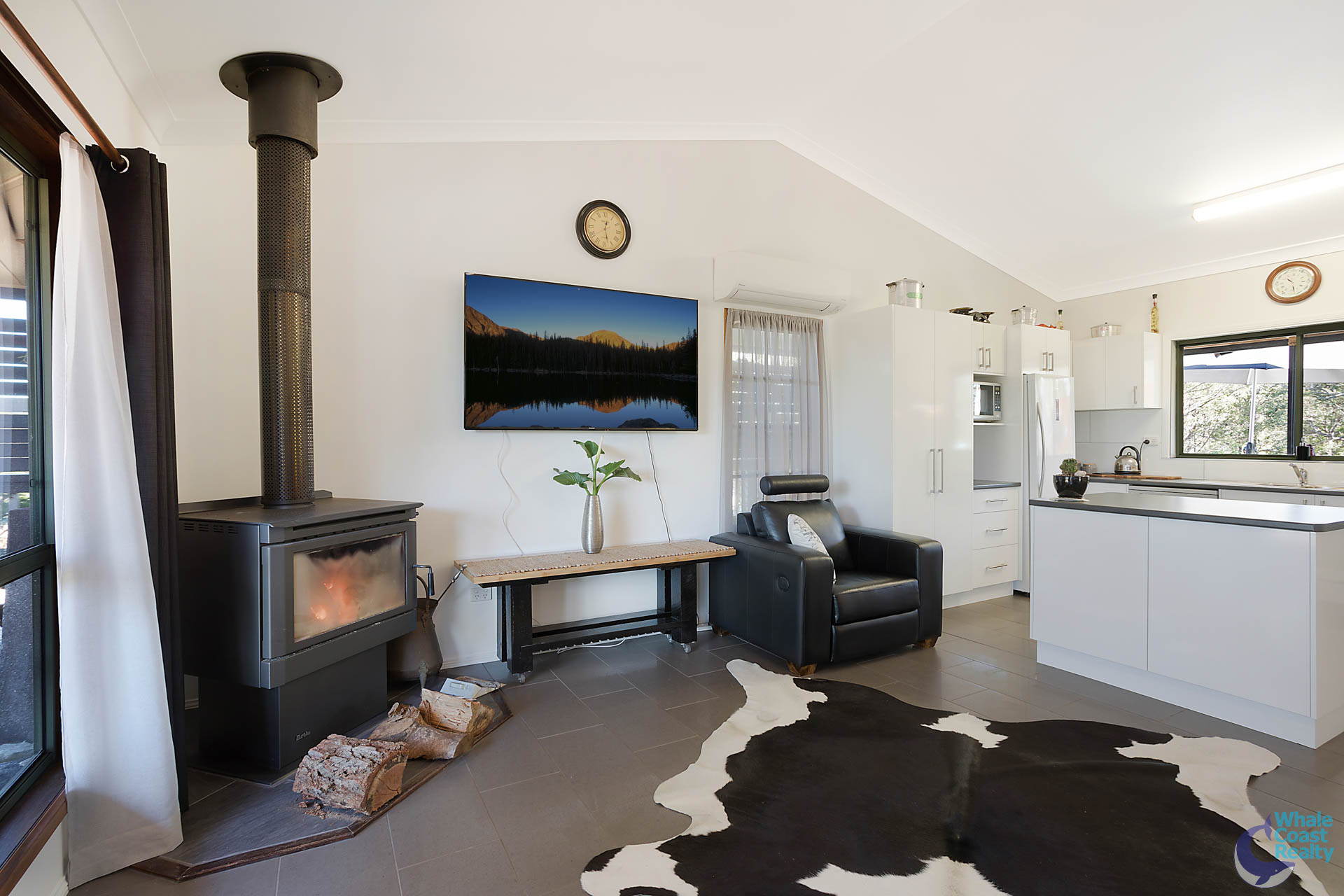 The high cathedral ceiling draws you into an open plan living area with combustion woodfire and fully renovated kitchen, leading off to a separate sitting area.