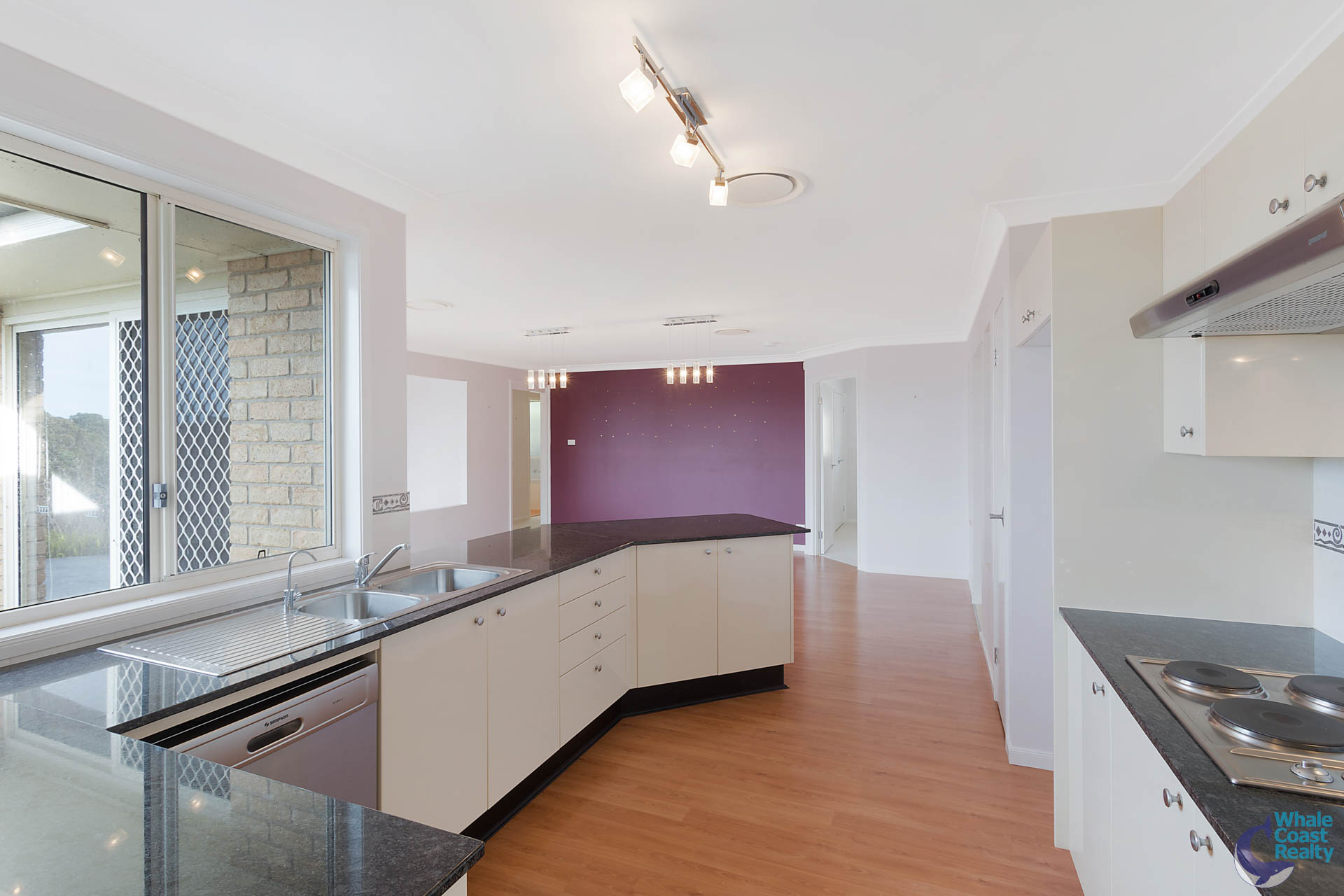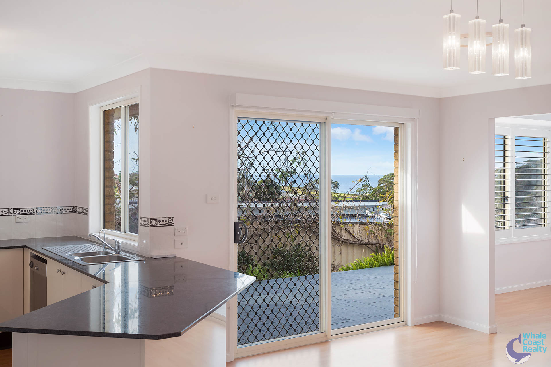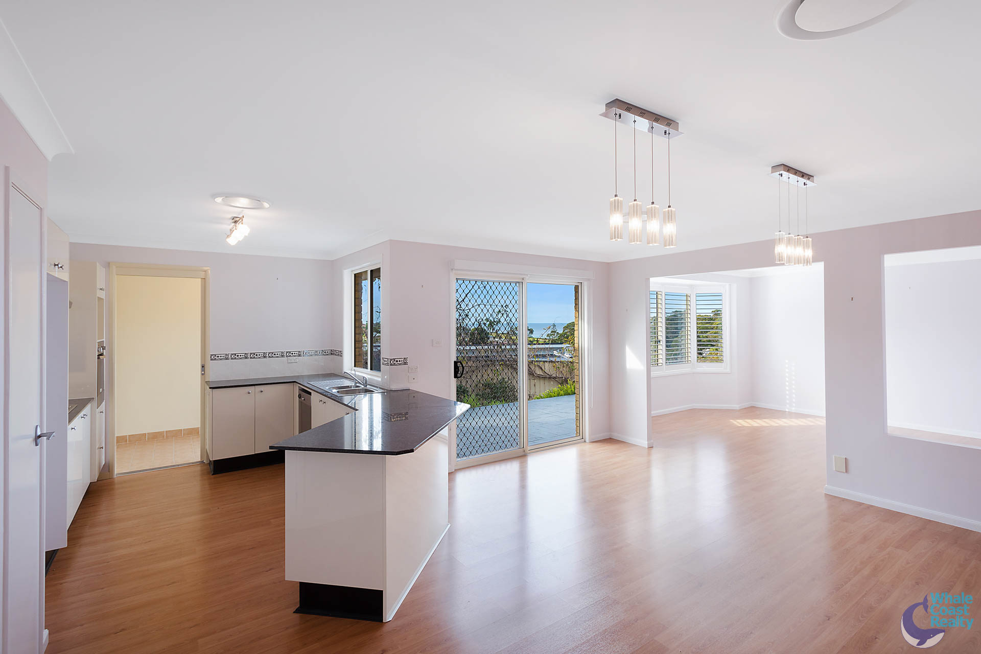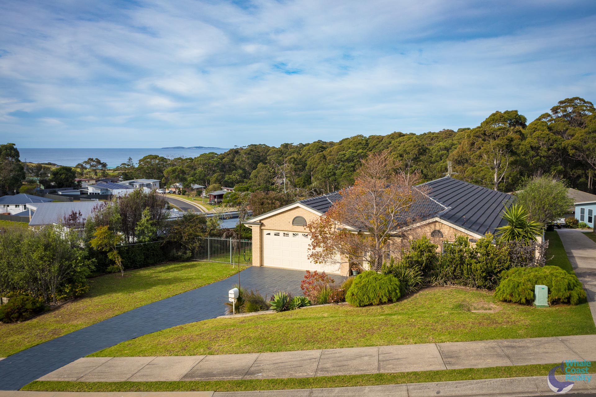 Internally there are two spacious, ducted air-conditioned, open plan living areas, both flow through to a central kitchen. The kitchen has a nice outlook over the rear patio and views of the ocean to Montague Island.