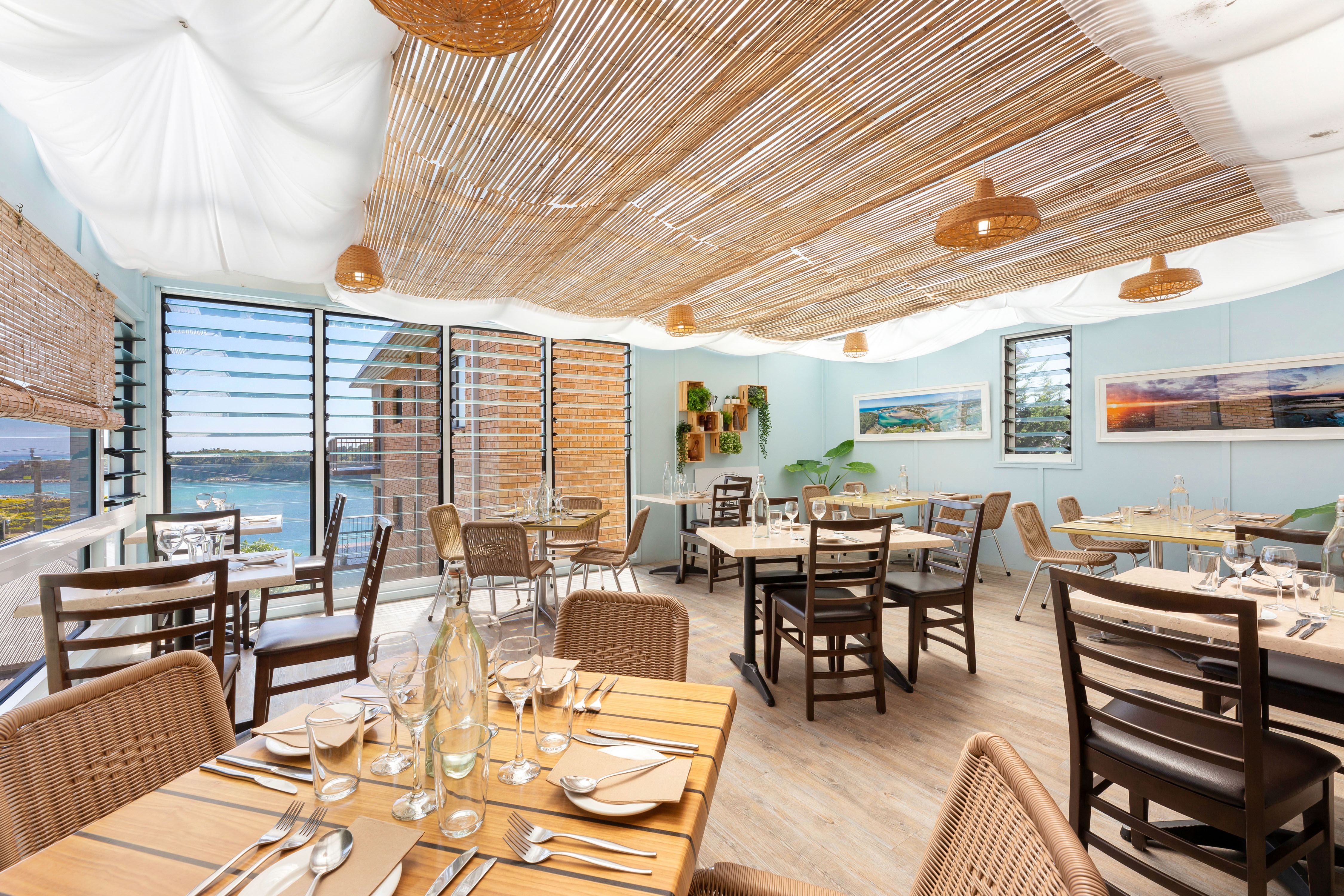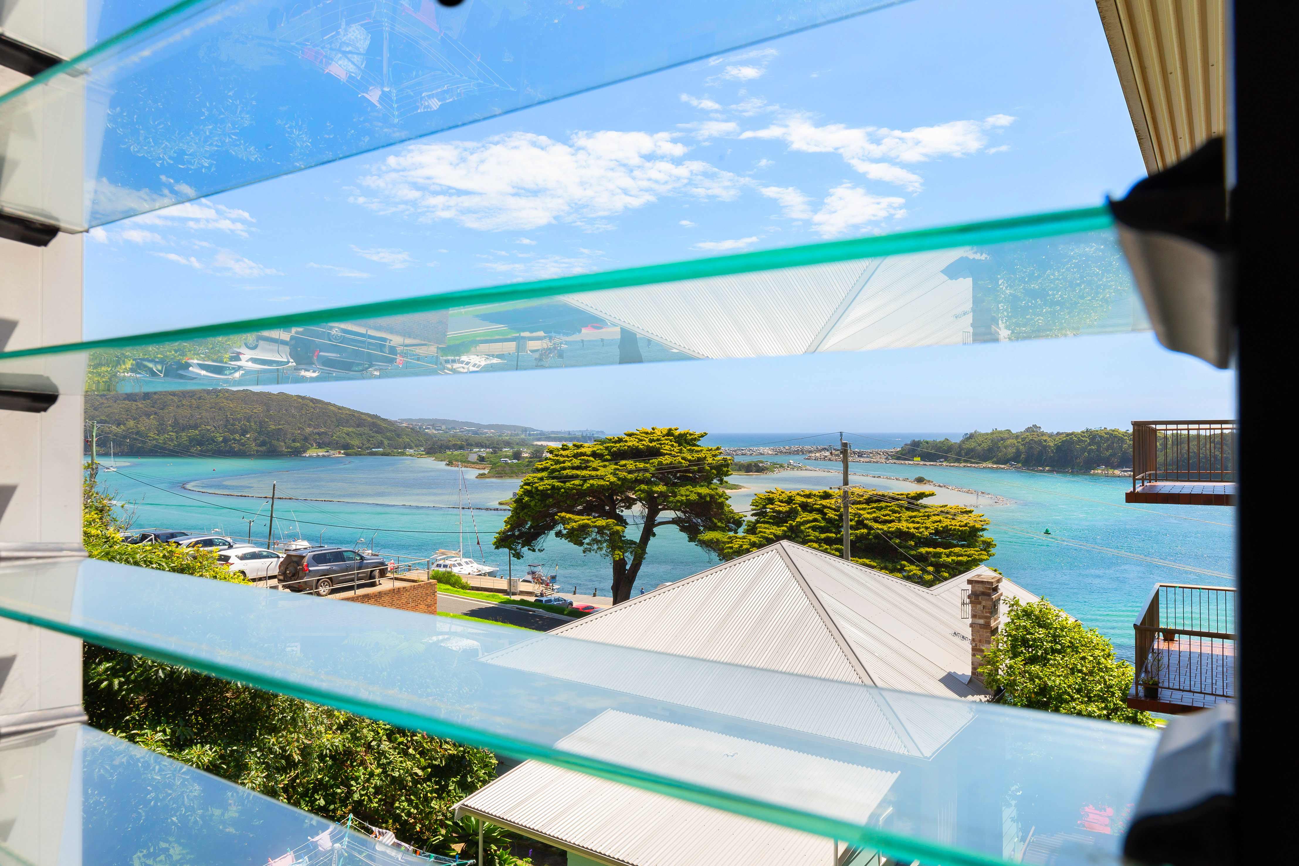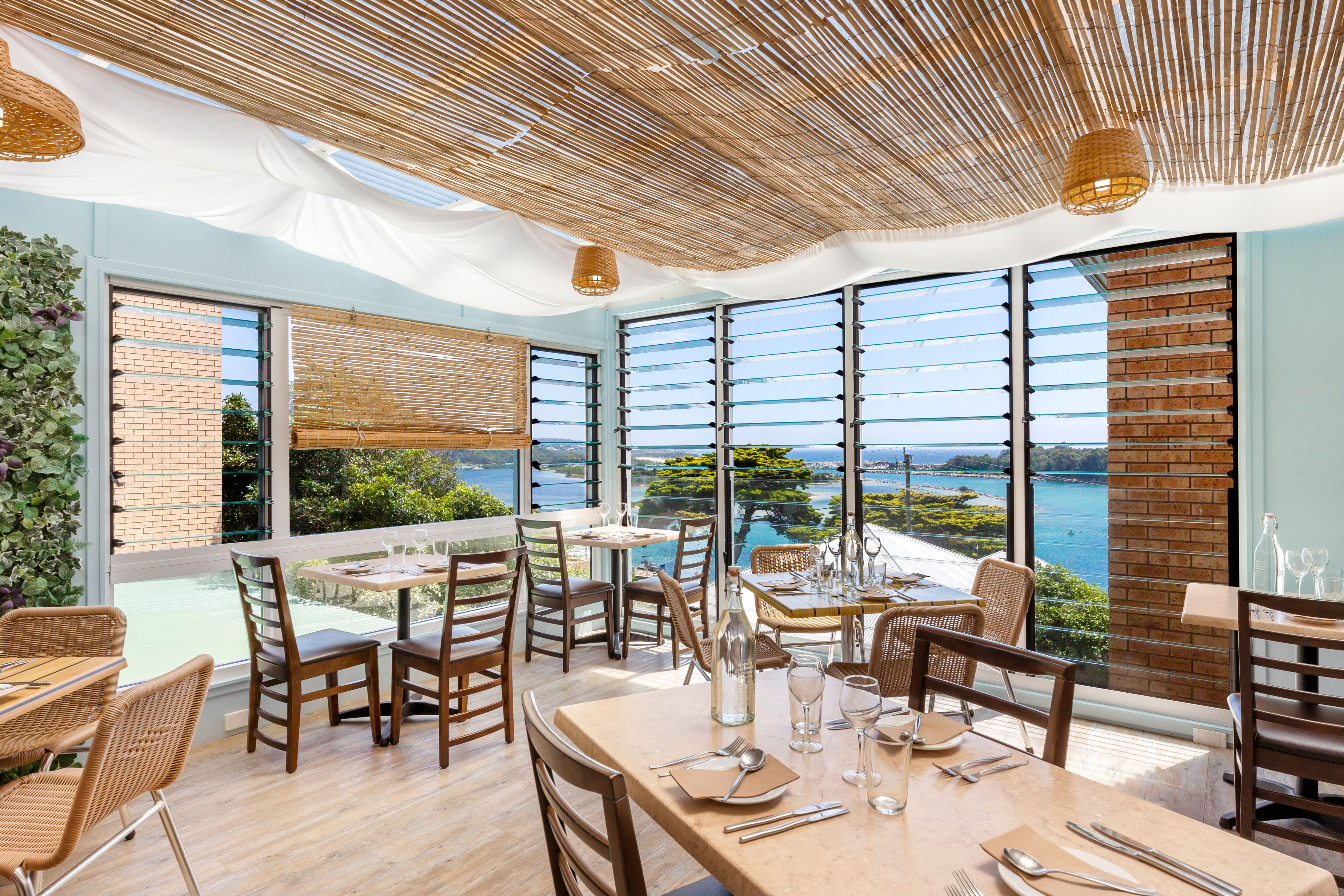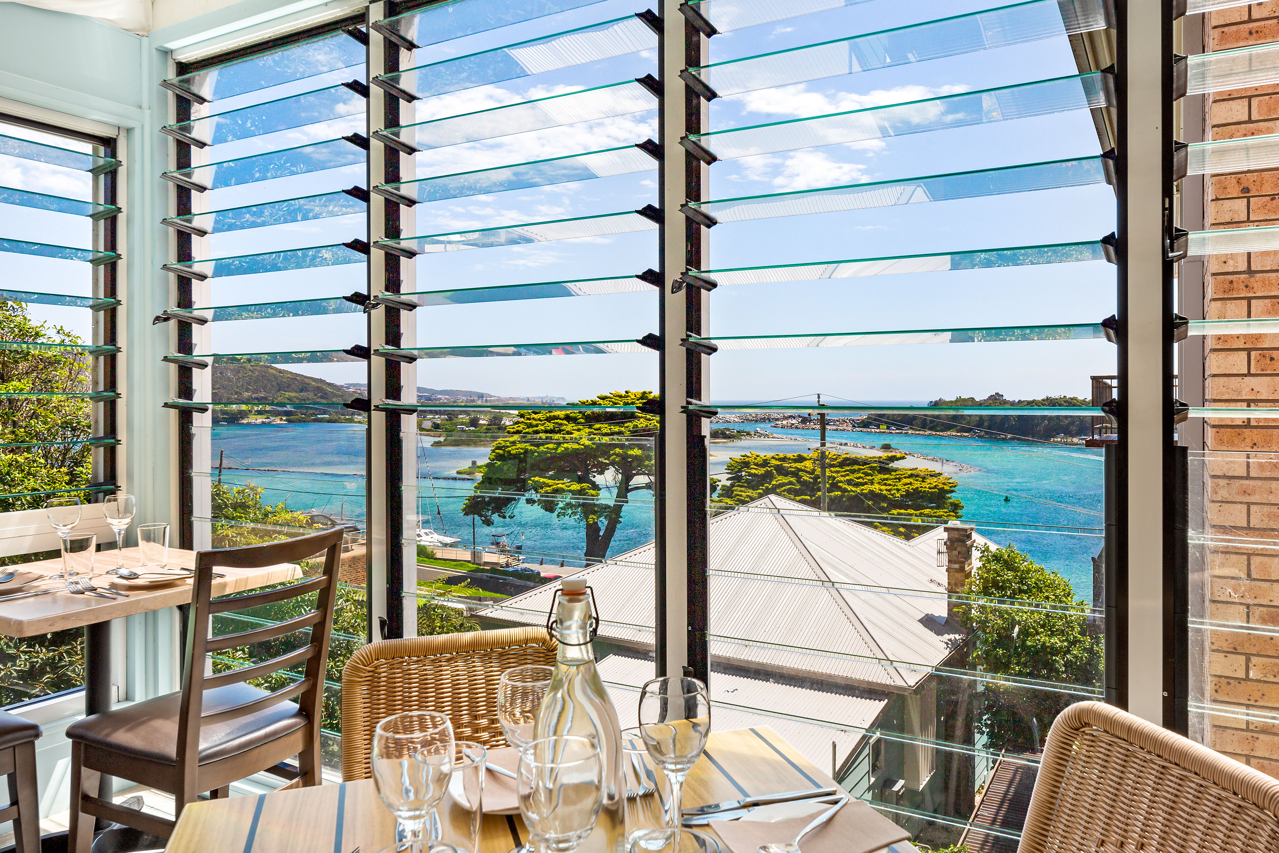 Sweeping views of Wagonga Inlet and the coastline from the rear dining area.