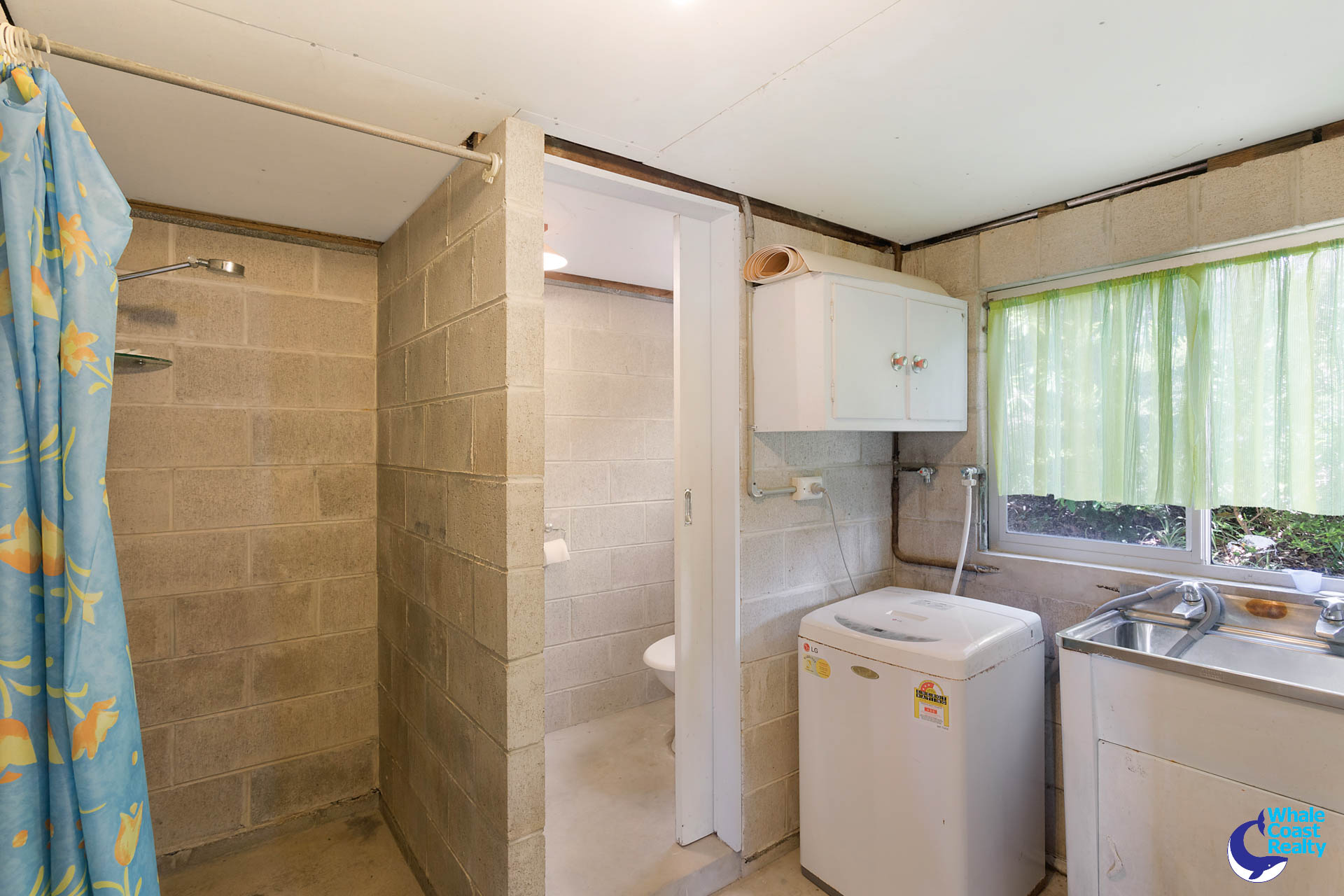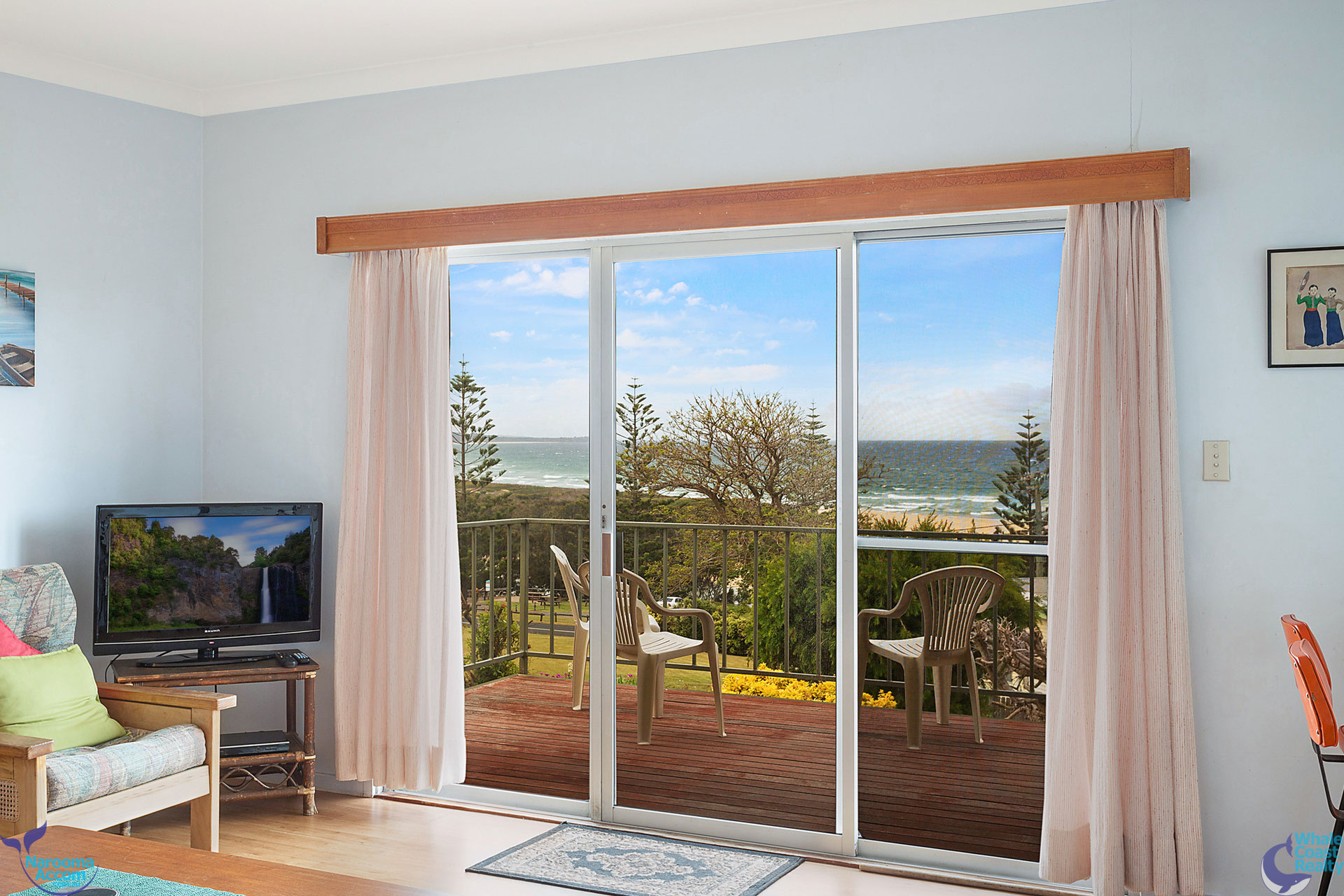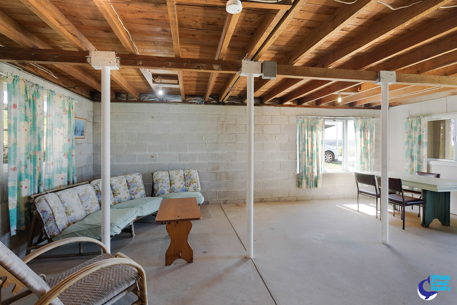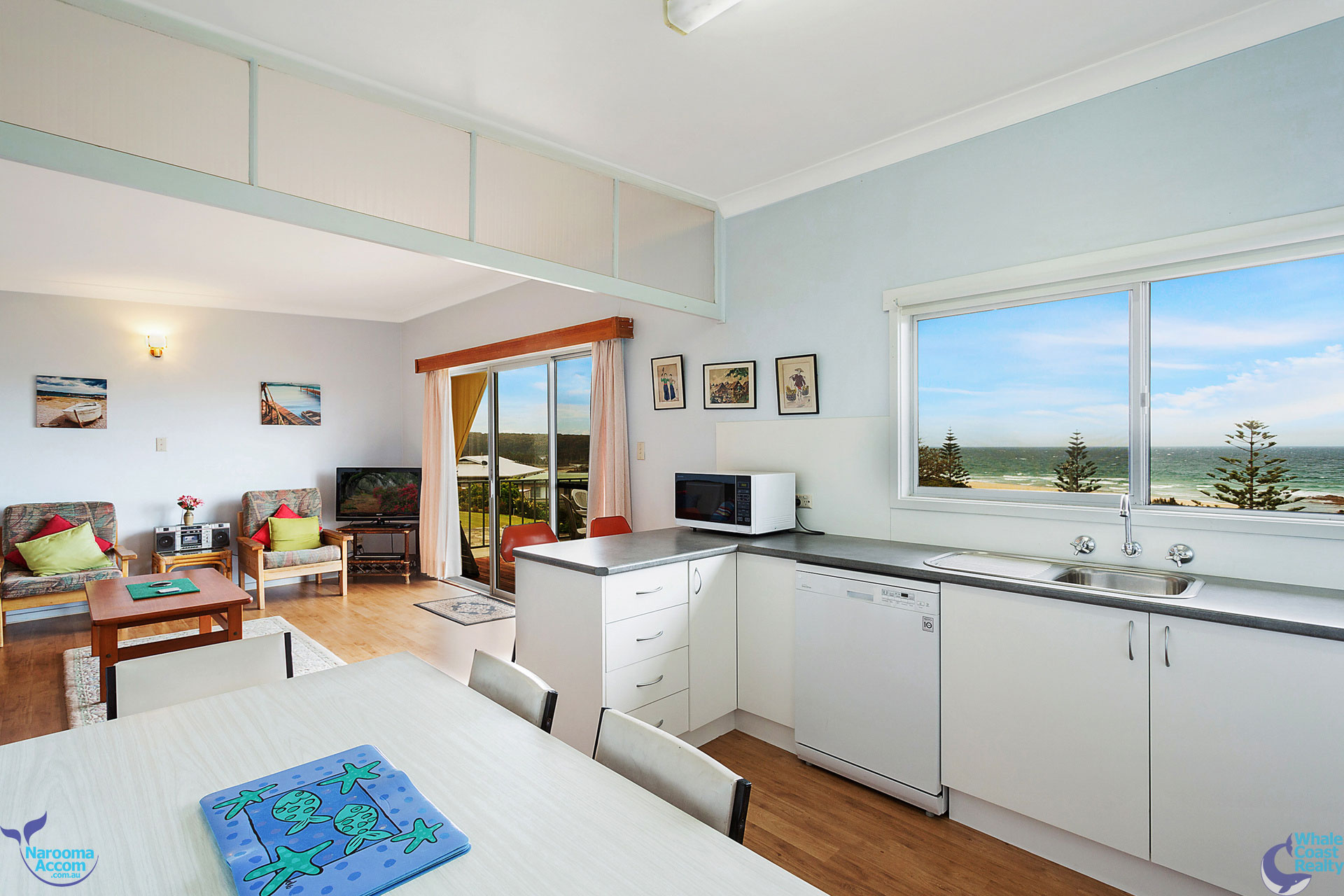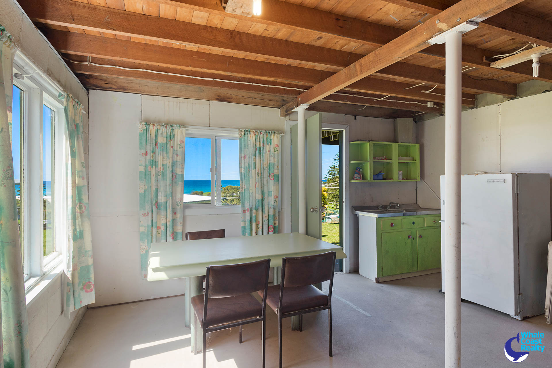 Upstairs features open plan living with access to a north facing deck that offers amazing beach and ocean views. Three bedrooms and one bathroom.