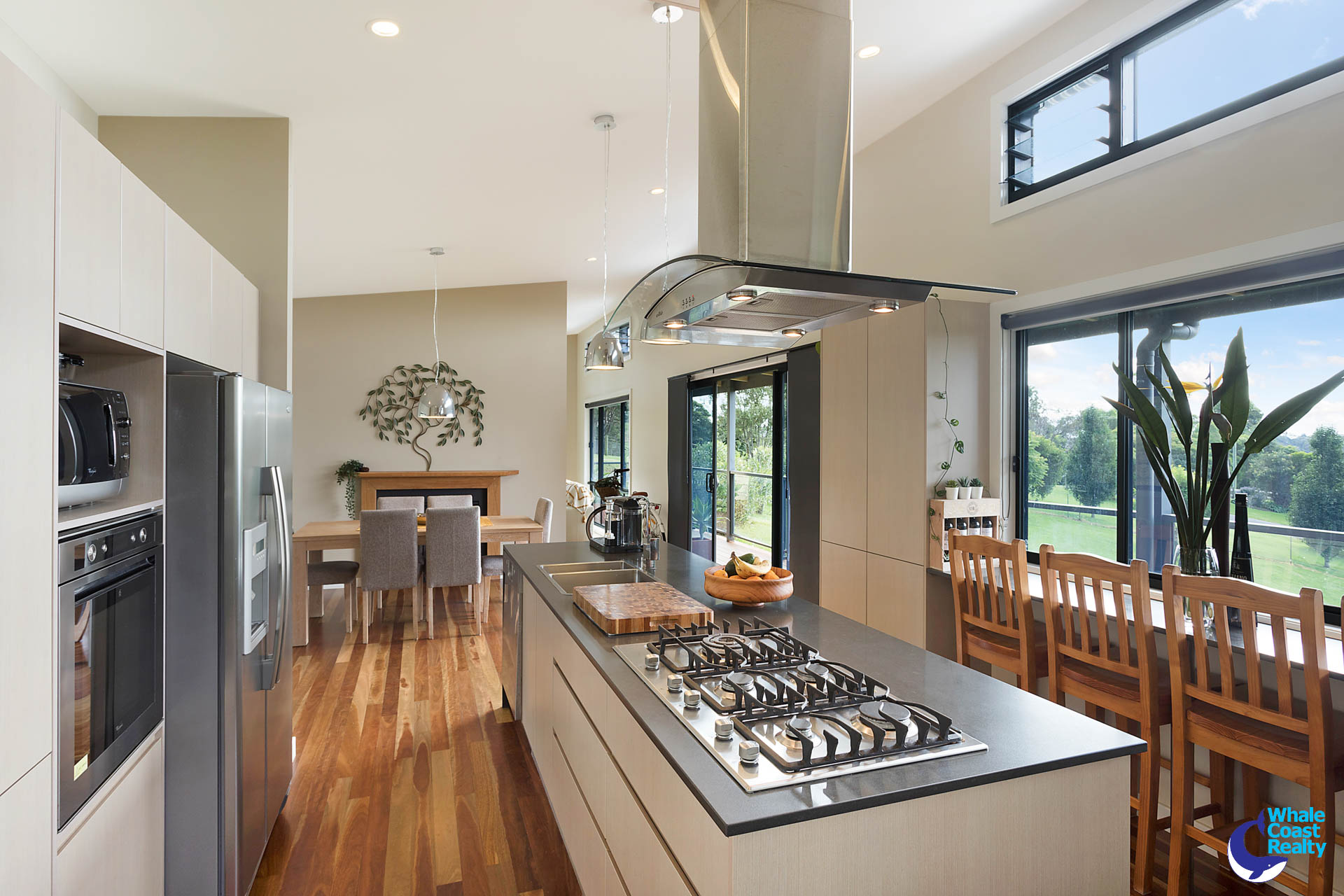 With all the inclusions expected of a master craftsman built home, featuring elegant finishes and lovely spotted gum flooring throughout. A flat level entry direct from undercover carports, leads into a light filled entrance and exposes the split level nature of the home. On the mid-level, a stylish kitchen including a breakfast bar that takes in the views, dining and lounge area flows out to an undercover wrap around sundeck.